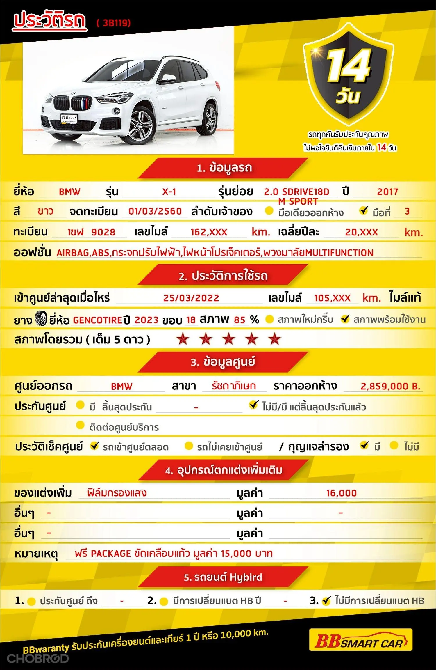 BMW X1 2.0 sDRIVE18d M SPORT (F48) AT 2017 ออกรถ 0 บาท จัดได้ 664,000 บ. Line:@*******แสดงข้อมูล 🔥 รับประกันคุณภาพ ไม่พอใจยินดีคืนเงินภายใน 14 วัน ที่เดียวในประเทศ 🔥 ซื้อรถกับ BB พร้อมให้คำปรึกษา แก้ทุกปัญหา ให้ทุกเรื่อง บริการ call center 24 ชม. 🔥 BB Care Plus รับประกันหลังการขาย สูงสุด 2 ปี หรือ 20,000 km. 🔥 มีรถให้เลือกมากกว่า 1,800 คัน บีบี 3 สาขาบางใหญ่ (ใกล้โลตัสบางใหญ่) รหัสรถ 3B119 ราคา 644,000 บ. ผ่อนเพียง 11,870 บ. Brand : BMW Year : 2017 Model : X1 Grade : 2.0 sDrive18d M SPORT (F48) Engine : 2000 CC. Type : ดีเซล Gearbox : A/T Color : ขาว Mileage : 162,xxx km. (ซื้อสด ราคานี้ยังไม่รวมค่าดำเนินการ 10,000 บ.) 🚩 Price 644,000 บาท ยอดจัด : 654,000 บาท เงินดาวน์ : ฟรีเงินดาวน์ ประกันภัย : ฟรีประกันภัย 1 ปี ค่าดำเนินการ : 10,000 บาท รวมออกรถ : 0 บาท ผ่อน 36 = 22,837 บาท ผ่อน 48 = 17,568 บาท ผ่อน 60 = 14,597 บาท ผ่อน 72 = 13,059 บาท ผ่อน 84 = 11,870 บาท *เงื่อนไขเป็นไปตามที่ไฟแนนซ์กำหนด โปรโมชั่นพิเศษ สำหรับลูกค้าเครดิตดี 🚩เลือกรับเรทดอกเบี้ยพิเศษ 📍36 งวด = 1.29% 📍48 งวด = 1.99% 📍60 งวด = 2.39% 📍72 งวด = 3.59% 🔥 เงื่อนไข โปรโมชั่น ดอกเบี้ยเริ่มต้น 1.29% ตลอดอายุสัญญา - ยอดจัดไฟแนนซ์ 300,000-600,0000 บาท - ผ่อนสูงสุด 72 เดือน - เป็นลูกค้าประวัติดี พนักงานประจำ เงินเดือน 20,000 บาท ขึ้นไป - ค่าดำเนินการแคมเปญ 20,000 บาท (รวมในยอดจัดได้) 🎗Car Hightlight รถสวย BMW X1 มาแล้วค่ะ ให้ความรู้สึกร้อนแรง ดูดุดัน เป็นรถในฝันของหนุ่มสาวหลายๆคนในราคาที่ใครๆ ก็สามารถเป็นเจ้าของได้ ภายในดีไซล์สวยมีความหรูหราสวยมากค่ะ 🎗ภายใน Interior Airbag วิทยุ - CD เซ็นทรัลล๊อก Cruise Control เบาะไฟฟ้าคู่หน้า กระจกไฟฟ้า แอร์ AUTO เบาะหนังแท้ ไมล์ Digital เบรกมือไฟฟ้า พวงมาลัยเพาเวอร์ เกียร์ Paddle Shift กระจกมองข้างปรับไฟฟ้า จอ LCD เล่น DVD เบรค ABS กุญแจรีโมท-สัญญานกันขโมย แอร์ Navigator เบาะบันทึก Memory พวงมาลัย Multifunction 🎗ภายนอก เป็นสีขาวสวยมากเซนเซอร์รอบคัน กระจกมองข้างพับไฟฟ้า ไฟตัดหมอก เซนเซอร์ถอยหลัง ไฟโปรเจคเตอร์ ไฟเลี้ยวกระจกมองข้าง เซนเซอร์รอบคัน กล้องส่องหลัง ไฟซีนอน ด้านหน้ารถ โดดเด่น ความคมชัดบนพื้นผิวเน้นเอกลักษณ์ของความเป็น BMW ถูกออกแบบมาให้ดูมีมิติ ความสปอร์ต หรูหรา ตามแบบฉบับ BMW 🎗ความคุ้มค่า หากคุณกำลังมองหารถหรู สภาพใหม่ ราคาเอื้อมถึงได้ต้องคันนี้เลยค่ะ หากเปรียบเทียบราคากับคุณภาพแล้วคันนี้คุ้มค่ามากค่ะ ⭐การรับประกันหลังการขาย BB Care Plus สูงสุด 2 ปี หรือ 20,000 km. ด้วยช่างที่ผ่านการอบรมจากศูนย์ชั้นนำของประเทศ 🎉Special offer เฉพาะ บีบีสมาร์ทคาร์ ที่นี่ที่เดียว ⭐ดอกเบี้ยเริ่มต้น 1.29% มีไฟแนนซ์รองรับหลายที่ค่ะ ⭐ฟรี!! แพคเก็จ ขัดเคลือบแก้ว มูลค่า 15,000 บาท ทุกคัน ⭐อนุมัติไว 30 นาที นำเอกสารมาให้ครบรับรถกลับบ้านทันทีค่ะ ⭐BB Care Plus รับประกันหลังการขาย สูงสุด 2 ปี หรือ 20,000 km. ⭐มี 6 สาขา ในกรุงเทพและปริมณฑลใกล้บ้านท่าน ⭐รถทุกคันผ่า
