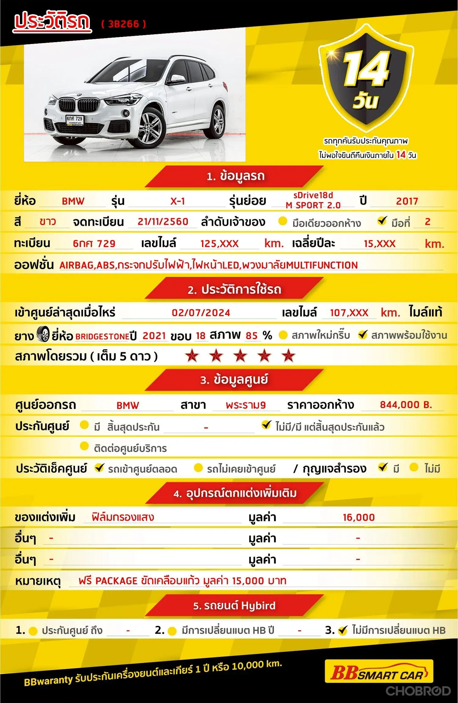 มีการรับประกันจากดีลเลอร์ (6 เดือน) มีบริการช่วยเหลือฉุกเฉินบนท้องถนน 24 ชม. จากดีลเลอร์