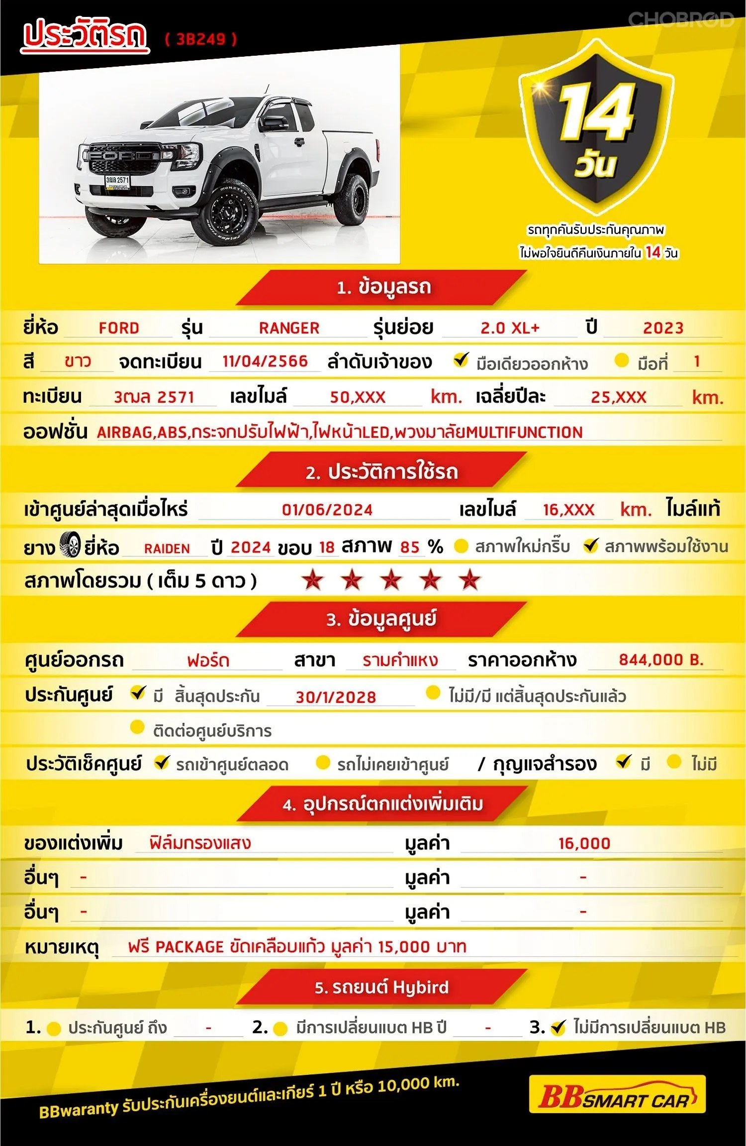 มีการรับประกันจากดีลเลอร์ (6 เดือน) มีบริการช่วยเหลือฉุกเฉินบนท้องถนน 24 ชม. จากดีลเลอร์
