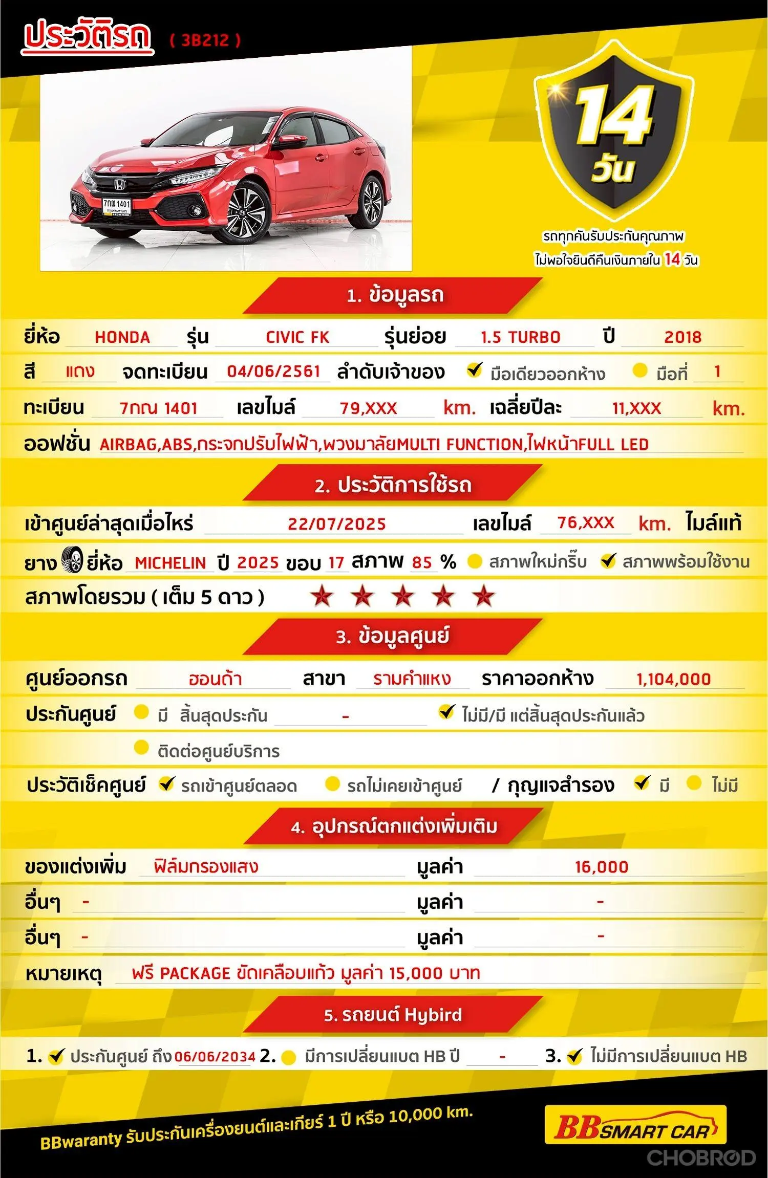 HONDA CIVIC FK 1.5 TURBO AT 2018 ออกรถ 0 บาท จัดได้ 689,000 บ. Line:@bbcar03 🔥 จอง 199 บาท ส่งบัตรประชาชน รู้ผลอนุมัติภายใน 30 นาที ไม่ผ่านคืนเงินจองทุกกรณี 🔥 ซื้อรถกับ BB พร้อมให้คำปรึกษา แก้ทุกปัญหา ให้ทุกเรื่อง บริการ call center 24 ชม. 🔥 BB Care Plus รับประกันหลังการขาย สูงสุด 2 ปี หรือ 20,000 km. 🔥มีรถให้เลือกมากกว่า 1,800 คัน บีบี 3 สาขาบางใหญ่ (ใกล้โลตัสบางใหญ่) รหัสรถ 3B212 ราคา 669,000 บ. ผ่อนเพียง 11,368 บ. Brand : HONDA Year : 2018 Model : CIVIC FK Grade : 1.5 TURBO Engine : 1500 CC. Type : เบนซิน Gearbox : A/T Color : แดง Mileage : 79,xxx km. (ซื้อสด ราคานี้ยังไม่รวมค่าดำเนินการ 10,000 บ.) 🚩 Price 669,000 บาท ยอดจัด : 679,000 บาท เงินดาวน์ : ฟรีเงินดาวน์ ประกันภัย : ฟรีประกันภัย 1 ปี ค่าดำเนินการ : 10,000 บาท รวมออกรถ : 0 บาท ผ่อน 36 = 21,871 บาท ผ่อน 48 = 16,826 บาท ผ่อน 60 = 13,980 บาท ผ่อน 72 = 12,506 บาท ผ่อน 84 = 11,368 บาท *เงื่อนไขเป็นไปตามที่ไฟแนนซ์กำหนด โปรโมชั่นพิเศษ สำหรับลูกค้าเครดิตดี 🚩เลือกรับเรทดอกเบี้ยพิเศษ 📍36 งวด = 1.29% 📍48 งวด = 1.99% 📍60 งวด = 2.39% 📍72 งวด = 3.59% 🔥 เงื่อนไข โปรโมชั่น ดอกเบี้ยเริ่มต้น 1.29% ตลอดอายุสัญญา - ยอดจัดไฟแนนซ์ 300,000-600,0000 บาท - ผ่อนสูงสุด 72 เดือน - เป็นลูกค้าประวัติดี พนักงานประจำ เงินเดือน 20,000 บาท ขึ้นไป - ค่าดำเนินการแคมเปญ 20,000 บาท (รวมในยอดจัดได้) 🎗Car Hightlight มาแล้วค่ะ HONDA CIVIC FC ความทันสมัยที่บวกกับความเรียบหรูลงตัว ดูสปอร์ต พร้อมอุปกรณ์อำนวยความสะดวกครบครัน ช่วงล่างที่แน่น ทำให้เกาะถนน และมีการทรงตัวที่ดี ทำให้ขับขี่ได้อย่างมั่นใจและรู้สึกปลอดภัย สภาพป้ายแดงค่ะ ราคาไม่แพง ไมล์แท้ รถดูแลศูนย์ตลอดค่ะ 🎗ภายใน ภายในสะอาดเรียบร้อยแอร์ เบรค ABS แอร์ AUTO Cruise Control กุญแจรีโมท-สัญญานกันขโมย Navigator พวงมาลัย Multifunction กระจกไฟฟ้า เบาะไฟฟ้าคู่หน้า Airbag จอ LCD เล่น DVD กระจกมองข้างปรับไฟฟ้า วิทยุ - CD พวงมาลัยเพาเวอร์ เบรกมือไฟฟ้า เบาะหนังแท้ ไมล์ Digital เซ็นทรัลล๊อก เกียร์ Paddle Shift อ๊อฟชั่นครบคันเลยค่ะ สภาพใหม่มากค่ะ 🎗ภายนอก ไม่มีชนหนักหรือพลิกคว่ำค่ะ มาพร้อมไฟขาว เซนเซอร์ถอยหลัง ไฟเลี้ยวกระจกมองข้าง กล้องส่องหลัง ไฟซีนอน กระจกมองข้างพับไฟฟ้า ไฟตัดหมอก ดูแลรักษาง่าย แถมช่วงล่างยังแน่นๆ ให้ความโดดเด่นเป็นเอกลักษณ์ของ HONDA CIVIC ทดลองขับแล้วช่วงล่างและเครื่องยนต์ยังแน่นค่ะ 🎗ความคุ้มค่า เป็นรถที่คุ้มค่าสุดๆ สามารถเหมาะกับการใช้งานยุคปัจจุบัน เราคัดเลือกสภาพรถคันนี้มาแล้ว สภาพดีมากๆ เทียบกับราคานี้ถือว่าคุ้มค่าสุดๆ ไปเลยจ้า ⭐การรับประกันหลังการขาย BB Care Plus สูงสุด 2 ปี หรือ 20,000 km. ด้วยช่างที่ผ่านการอบรมจากศูนย์ชั้นนำของประเทศ 🎉Special offer เฉพาะ บีบีสมาร์ทคาร์ ที่นี่ที่เดียว ⭐ดอกเบี้ยเริ่มต้น 1.29% มีไฟแนนซ์รองรับหลายที่ค่ะ ⭐ฟรี!! แพคเก็จ ขัดเคลือบแก้ว มูลค่า 15,000 บาท ทุกคัน ⭐อนุมัติไว 30 นาที นำเอกสารม
