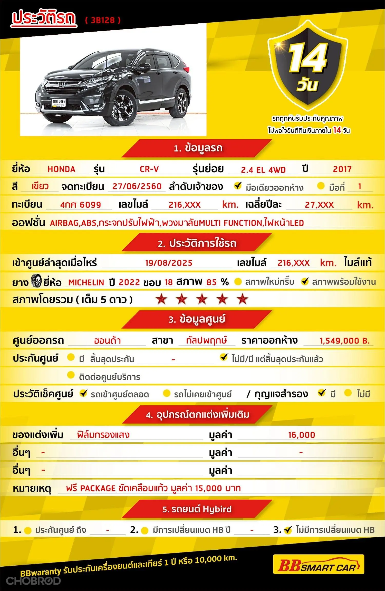 HONDA CR-V 2.4 EL AT4WD 2017 ออกรถ 0 บาท จัดได้ 589,000 บ. Line:@*******แสดงข้อมูล 🔥 รับประกันคุณภาพ ไม่พอใจยินดีคืนเงินภายใน 14 วัน ที่เดียวในประเทศ 🔥 ซื้อรถกับ BB พร้อมให้คำปรึกษา แก้ทุกปัญหา ให้ทุกเรื่อง บริการ call center 24 ชม. 🔥 BB Care Plus รับประกันหลังการขาย สูงสุด 2 ปี หรือ 20,000 km. 🔥 มีรถให้เลือกมากกว่า 1,600 คัน บีบี3 สาขาบางใหญ่ (ใกล้โลตัสบางใหญ่) รหัสรถ 3B128 ราคา 569,000 บ. ผ่อนเพียง 9,693 บ. Brand : HONDA Year : 2017 Model : CR-V Grade : 2.4 EL Engine : 2400 CC. Type : เบนซิน Gearbox : AT4WD Color : เขียว Mileage : 216,xxx km. (ซื้อสด ราคานี้ยังไม่รวมค่าดำเนินการ 10,000 บ.) 🎗 Price 569,000 บาท ยอดจัด : 579,000 บาท เงินดาวน์ : ฟรีเงินดาวน์ ประกันภัย : ฟรีประกันภัย 1 ปี ค่าดำเนินการ : 10,000 บาท รวมออกรถ : 0 บาท ผ่อน 36 = 18,650 บาท ผ่อน 48 = 14,348 บาท ผ่อน 60 = 11,921 บาท ผ่อน 72 = 10,665 บาท ผ่อน 84 = 9,693 บาท *เงื่อนไขเป็นไปตามที่ไฟแนนซ์กำหนด โปรโมชั่นพิเศษ สำหรับลูกค้าเครดิตดี 🚩เลือกรับเรทดอกเบี้ยพิเศษ 📍36 งวด = 1.29% 📍48 งวด = 1.99% 📍60 งวด = 2.39% 📍72 งวด = 3.59% 🔥 เงื่อนไข โปรโมชั่น ดอกเบี้ยเริ่มต้น 1.29% ตลอดอายุสัญญา - ยอดจัดไฟแนนซ์ 300,000-600,0000 บาท - ผ่อนสูงสุด 72 เดือน - เป็นลูกค้าประวัติดี พนักงานประจำ เงินเดือน 20,000 บาท ขึ้นไป - ค่าดำเนินการแคมเปญ 20,000 บาท (รวมในยอดจัดได้) 🎗Car Hightlight มาอีกแล้วคะ HONDA CR-V เครื่อง 2400 cc. รถสปอร์ตอเนกประสงค์ ที่มาพร้อมกับภาพลักษณ์หรูหรา และโดดเด่นทุกองศารอบคัน สัมผัสประสบการณ์ใหม่ของความสะดวกสบาย อีกระดับด้วยเทคโนโลยีอัจฉริยะล้ำสมัย 🎗ภายใน สะดวกสบายกว่าที่เคยกับอุปกรณ์อำนวยความสะดวกรอบคัน แอร์ พวงมาลัยเพาเวอร์ วิทยุ - CD Cruise Control เบาะไฟฟ้าคู่หน้า เบาะหนังแท้ พวงมาลัย Multifunction กระจกมองข้างปรับไฟฟ้า จอ LCD เล่น DVD เบรค ABS แอร์ AUTO เซ็นทรัลล๊อก กระจกไฟฟ้า กุญแจรีโมท-สัญญานกันขโมย Navigator ภายในลายไม้ Airbag เบรกมือไฟฟ้า ไมล์ Digital 🎗ภายนอก ไม่มีชนหนักหรือพลิกคว่ำค่ะ ไม่จมน้ำ มาพร้อม ไฟซีนอน กล้องส่องหลัง ไฟตัดหมอก ไฟเลี้ยวกระจกมองข้าง คิ้วกันสาด กระจกมองข้างพับไฟฟ้า ดูแลรักษาง่าย แถมช่วงล่างยังแน่นๆ ให้ความโดดเด่นเป็นเอกลักษณ์ของ HONDA ทดลองขับแล้วช่วงล่างและเครื่องยนต์ยังแน่นค่ะ 🎗ความคุ้มค่า สำหรับใครที่กำลังมองหารถใหม่ลองเข้ามาดู ประหยัดเงินไปเยอะมาก ใช้งานสะดวกสบาย ประหยัดน้ำมันมากๆ เทียบกับราคานี้ถือว่าคุ้มค่ามากๆ ทีมงานทำราคาที่ดีที่สุด เหมาะสมกับสภาพรถเทียบกับสเปคเดียวกันรับประกันเราขายถูกกว่าแน่นอน ⭐การรับประกันหลังการขาย BB Care Plus สูงสุด 2 ปี หรือ 20,000 km. ด้วยช่างที่ผ่านการอบรมจากศูนย์ชั้นนำของประเทศ 🎉Special offer เฉพาะ บีบีสมาร์ทคาร์ ที่นี่ที่เดียว ⭐ดอกเบี้ยเริ่มต้น 1.29% มีไฟแนนซ์รองรับหลายที่ค่ะ ⭐ฟรี!! แพคเก็จ ขัดเคลือบแก้ว มูลค่า 15,000 บาท ทุกคัน ⭐อนุมัติไว 30 นาที นำ