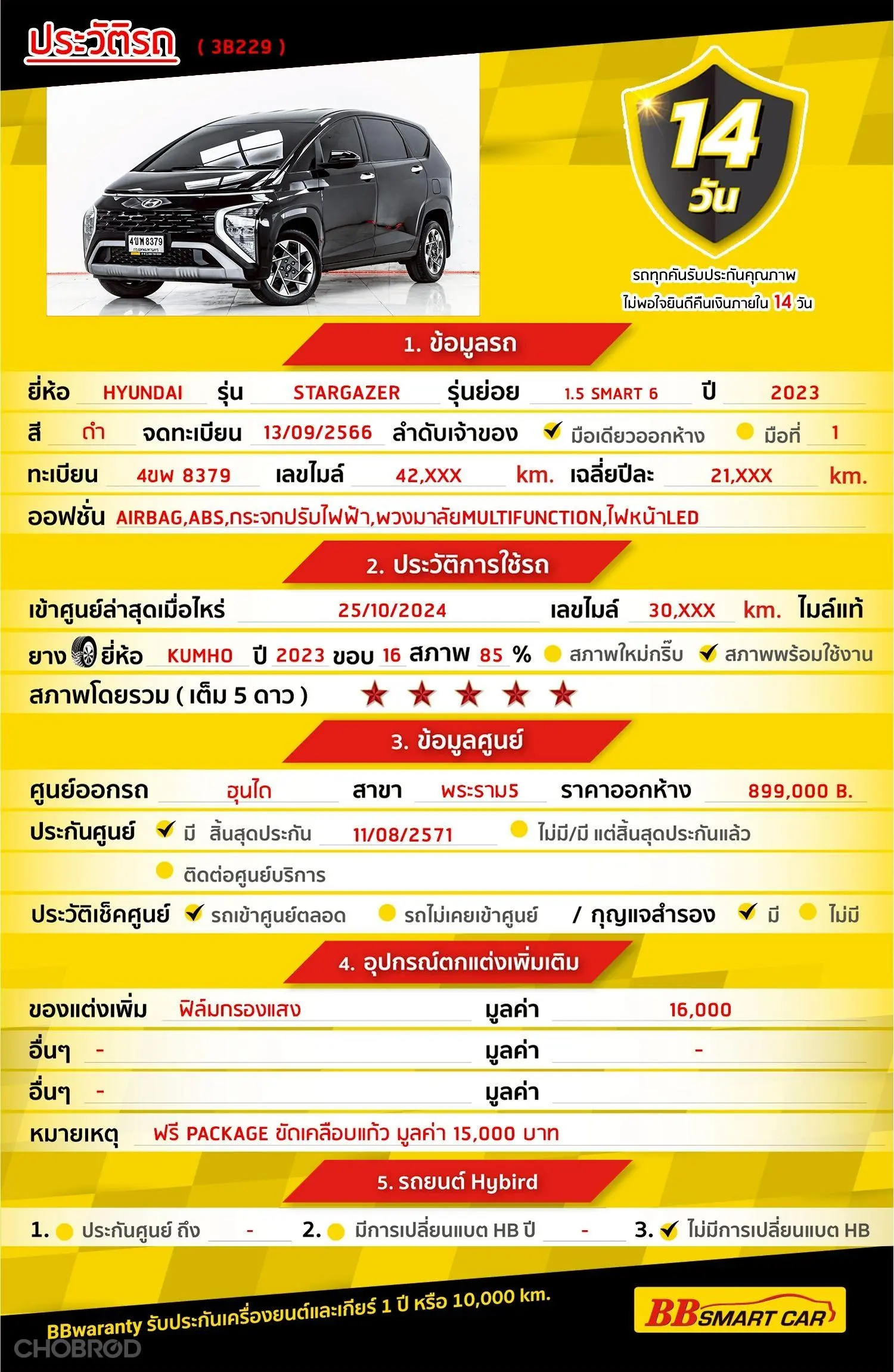 HYUNDAI STARGAZER 1.5 SMART 6 AT 2023 ออกรถ 0 บาท จัดได้ 539,000 บ. Line:@bbcar03 🔥 จอง 199 บาท ส่งบัตรประชาชน รู้ผลอนุมัติภายใน 30 นาที ไม่ผ่านคืนเงินจองทุกกรณี 🔥 ซื้อรถกับ BB พร้อมให้คำปรึกษา แก้ทุกปัญหา ให้ทุกเรื่อง บริการ call center 24 ชม. 🔥 BB Care Plus รับประกันหลังการขาย สูงสุด 2 ปี หรือ 20,000 km. 🔥 มีรถให้เลือกมากกว่า 1,800 คัน สาขา 3 ถ.กาญจนาภิเษก ใกล้กับโลตัสบางใหญ่ รหัสรถ 3B229 ราคา 519,000 บ. ผ่อนเพียง 8,856 บ. Brand : HYUNDAI Year : 2023 Model : STARGAZER Grade : 1.5 SMART 6 Engine : 1500 CC. Type : เบนซิน Gearbox : A/T Color : ดำ Mileage : 42,xxx km. (ซื้อสด ราคานี้ยังไม่รวมค่าดำเนินการ 10,000 บ.) 🚩 Price : 519,000 บาท ยอดจัด : 529,000 บาท เงินดาวน์ : ฟรีเงินดาวน์ ประกันภัย : ฟรีประกันภัย 1 ปี ค่าดำเนินการ : 10,000 บาท รวมออกรถ : 0 บาท ผ่อน 36 = 17,039 บาท ผ่อน 48 = 13,109 บาท ผ่อน 60 = 10,892 บาท ผ่อน 72 = 9,743 บาท ผ่อน 84 = 8,856 บาท *เงื่อนไขเป็นไปตามที่ไฟแนนซ์กำหนด โปรโมชั่นพิเศษ สำหรับลูกค้าเครดิตดี 🚩เลือกรับเรทดอกเบี้ยพิเศษ 📍36 งวด = 1.29% 📍48 งวด = 1.99% 📍60 งวด = 2.39% 📍72 งวด = 3.59% 🔥 เงื่อนไข โปรโมชั่น ดอกเบี้ยเริ่มต้น 1.29% ตลอดอายุสัญญา - ยอดจัดไฟแนนซ์ 300,000-600,0000 บาท - ผ่อนสูงสุด 72 เดือน - เป็นลูกค้าประวัติดี พนักงานประจำ เงินเดือน 20,000 บาท ขึ้นไป - ค่าดำเนินการแคมเปญ 20,000 บาท (รวมในยอดจัดได้) 🎗Car Hightlight ออกแบบด้วยความสมบูรณ์แบบในทุกมิติ ด้วยการออกแบบขนาดของตัวรถที่กว้าง และลงตัวด้วยลวดลายการออกแบบที่ดูทันสมัย ดูเป็นรถยนต์ครอบครัวที่เหมาะแก่การครอบครองมากค่ะ 🎗ภายใน. กุญแจรีโมท-สัญญานกันขโมย Navigator แอร์ราว เบรค ABS พวงมาลัย Multifunction แอร์ เบาะหนังแท้ แอร์ AUTO Airbag พวงมาลัยเพาเวอร์ กระจกมองข้างปรับไฟฟ้า ไมล์ Digital จอ LCD เล่น DVD เซ็นทรัลล๊อก วิทยุ - CD 🎗ภายนอก. รถคันนี้เป็นสีดำ ขับขี่ได้อย่างสบาย ปลอดภัย และเร่งแซงได้อย่างมั่นใจ เพียบพร้อมด้วยระบบความปลอดภัยครบครัน รวมถึงอุปกรณ์มาตรฐานและอุปกรณ์อำนวยความสะดวกให้แก่ผู้ขับขี่และผู้โดยสารตลอดการเดินทาง กระจกไฟฟ้า ไฟตัดหมอก กล้องส่องหลัง เซนเซอร์ถอยหลัง ไฟโปรเจคเตอร์ ไฟเลี้ยวกระจกมองข้าง ไฟซีนอน 🎗ความคุ้มค่า คัดเลือกคันนี้มาแล้วค่ะสภาพดีมากๆ เทียบกับราคานี้ถือว่าคุ้มค่ามากๆค่ะ มาดูรถไม่ผิดหวังแน่นนอนค่ะ ⭐การรับประกันหลังการขาย BB Care Plus สูงสุด 2 ปี หรือ 20,000 km. ด้วยช่างที่ผ่านการอบรมจากศูนย์ชั้นนำของประเทศ 🎉Special offer เฉพาะ บีบีสมาร์ทคาร์ ที่นี่ที่เดียว ⭐ดอกเบี้ยเริ่มต้น 1.29% มีไฟแนนซ์รองรับหลายที่ค่ะ ⭐ฟรี!! แพคเก็จ ขัดเคลือบแก้ว มูลค่า 15,000 บาท ทุกคัน ⭐อนุมัติไว 30 นาที นำเอกสารมาให้ครบรับรถกลับบ้านทันทีค่ะ ⭐BB Care Plus รับประกันหลังการขาย สูงสุด 2 ปี หรือ 20,000 km. ⭐มี 6 สาขา ในกรุงเทพและปริมณฑลใกล้บ้านท่าน ⭐รถทุกคันผ่านตรวจสอบ Inspection เรียบแล้วค่ะ ผ่าน 5 ดาวทุกคันค่ะ ⭐เซลล์ท