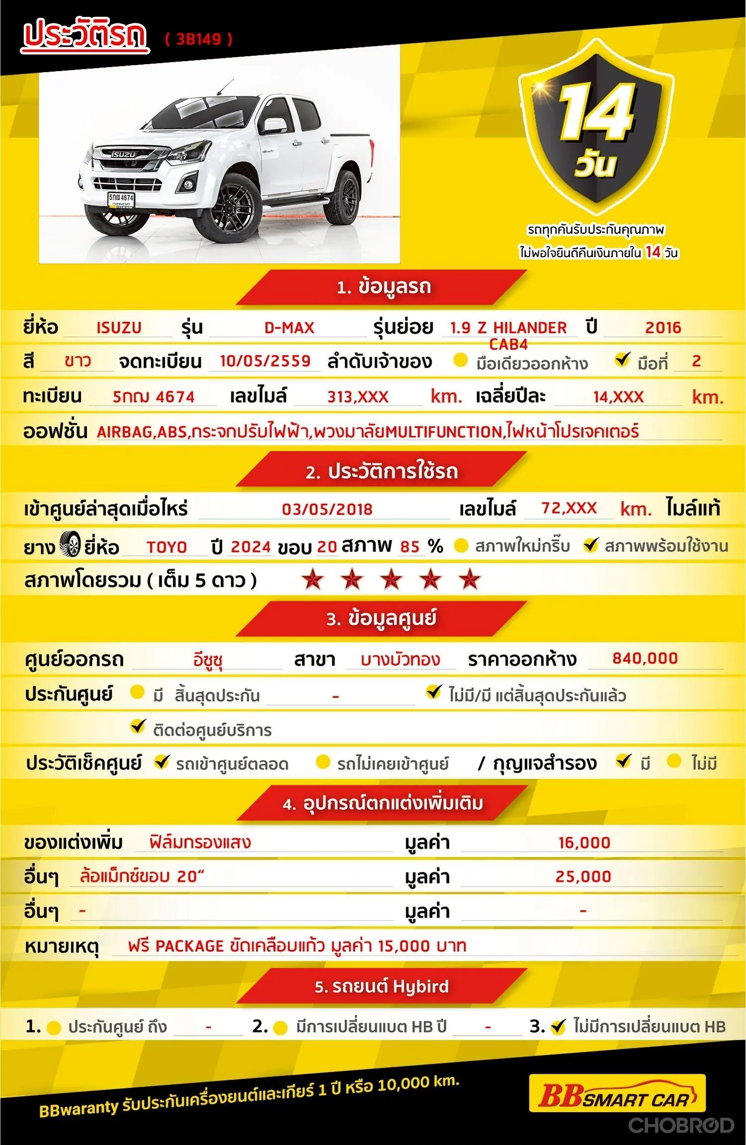 มีการรับประกันจากดีลเลอร์ (6 เดือน) มีบริการช่วยเหลือฉุกเฉินบนท้องถนน 24 ชม. จากดีลเลอร์