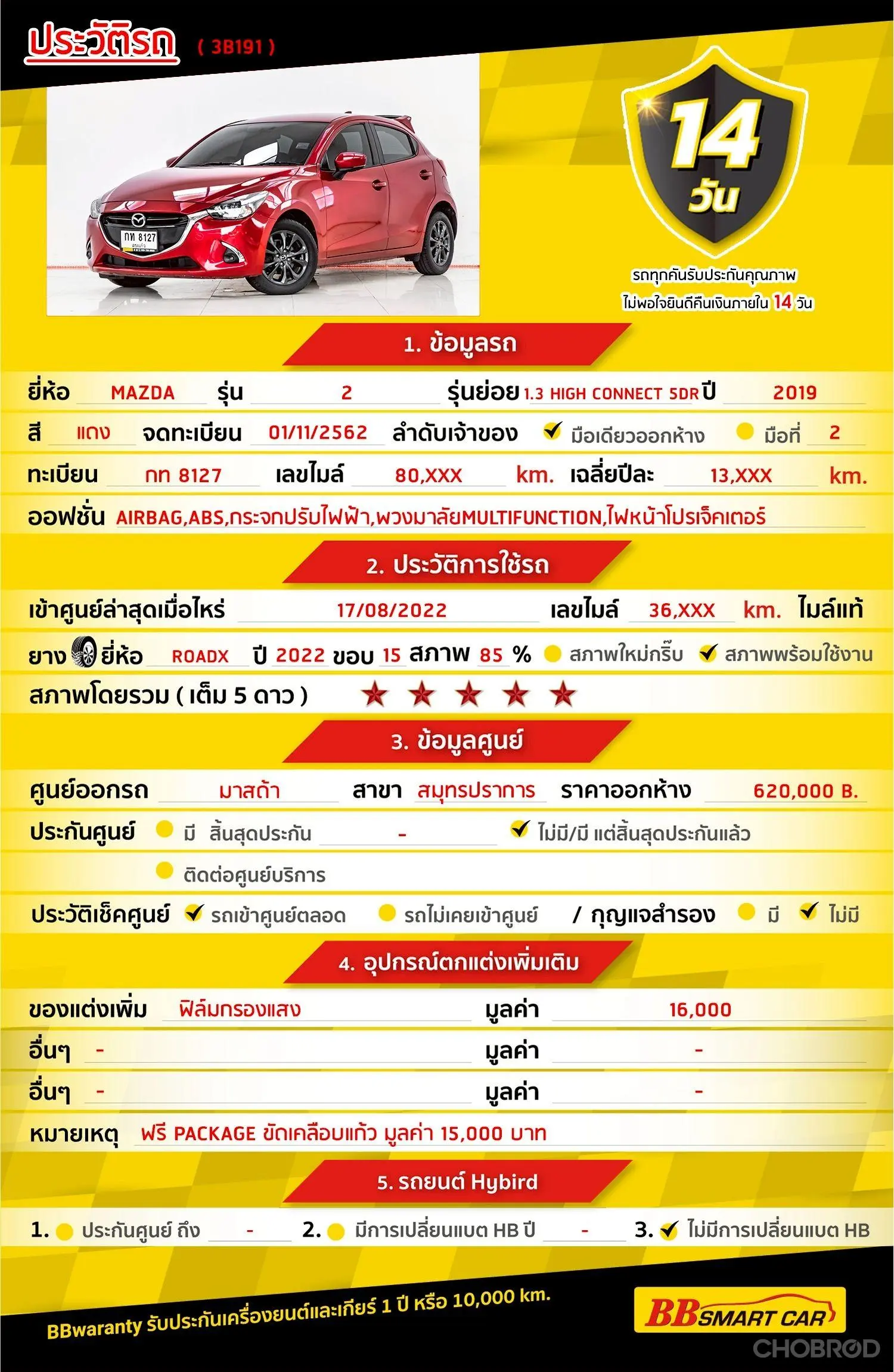 MAZDA 2 1.3 HIGH CONNECT AT 2019 ออกรถ 0 บาท จัดได้ 339,000 บ. Line:@*******แสดงข้อมูล 🔥 จอง 199 บาท ส่งบัตรประชาชน รู้ผลอนุมัติภายใน 30 นาที ไม่ผ่านคืนเงินจองทุกกรณี 🔥 ซื้อรถกับ BB พร้อมให้คำปรึกษา แก้ทุกปัญหา ให้ทุกเรื่อง บริการ call center 24 ชม. 🔥 BB Care Plus รับประกันหลังการขาย สูงสุด 2 ปี หรือ 20,000 km. 🔥 มีรถให้เลือกมากกว่า 1,800 คัน สาขา 3 ถนนกาญจนาภิเษก ใกล้โลตัสบางใหญ่ รหัสรถ 3B191 ราคา 319,000 บ. ผ่อนเพียง 5,508 บ. Brand. : MAZDA Year. : 2019 Model. : 2 Grade. : 1.3 HIGH COONECT 5DR Engine. : 1300 CC Type. : เบนซิน Gearbox : A/T Color. : แดง Mileage. : 80,XXX km. (ซื้อสด ราคานี้ยังไม่รวมค่าดำเนินการ 10,000 บ.) 🚩 Price. 319,000 บาท ยอดจัด : 329,000 บาท เงินดาวน์ : 0 บาท ประกันภัย : ฟรีประกันภัย 1 ปี ค่าดำเนินการ : 10,000 บาท รวมออกรถ : 0 บาท ผ่อน 36 = 10,597 บาท ผ่อน 48 = 8,152 บาท ผ่อน 60 = 6,774 บาท ผ่อน 72 = 6,059 บาท ผ่อน 84 = 5,508 บาท *เงื่อนไขเป็นไปตามที่ไฟแนนซ์กำหนด โปรโมชั่นพิเศษ สำหรับลูกค้าเครดิตดี 🚩เลือกรับเรทดอกเบี้ยพิเศษ 📍36 งวด = 1.29% 📍48 งวด = 1.99% 📍60 งวด = 2.39% 📍72 งวด = 3.59% 🔥 เงื่อนไข โปรโมชั่น ดอกเบี้ยเริ่มต้น 1.29% ตลอดอายุสัญญา - ยอดจัดไฟแนนซ์ 300,000-600,0000 บาท - ผ่อนสูงสุด 72 เดือน - เป็นลูกค้าประวัติดี พนักงานประจำ เงินเดือน 20,000 บาท ขึ้นไป - ค่าดำเนินการแคมเปญ 20,000 บาท (รวมในยอดจัดได้) 🎗Car Hightlight รถสวยๆ วันนี้ขอแนะนำ MAZDA 2 แฝงไว้ซึ่งความท้าทายภายใต้รูปทรงสปอร์ตหรู ทุกเส้นสายบนตัวรถ สะท้อนถึงความโฉบเฉี่ยว หน้าโดดเด่นด้วยไฟหน้าโปรเจคเตอร์แบบ 4-Beam ทรงสปอร์ต กระจังหน้าห้าเหลี่ยม สวยงามกลมกลืนลงตัวกับเส้นสายข้างตัวรถ ภายในของมาสด้า 2 โดดเด่นด้วยห้องโดยสารที่กว้างขวาง โอ่อ่า โปร่งสบาย ให้ความรู้สึกอิสระ 🎗ภายใน. สำหรับ MAZDA 2 คันนี้อุปกรณ์ข้างในเหมือนได้มือ1 เลยค่ะ กุญแจรีโมท-สัญญานกันขโมย เบาะผ้า พวงมาลัย Multifunction วิทยุ - CD Cruise Control แอร์ ไมล์ Digital เบรค ABS กระจกมองข้างปรับไฟฟ้า Airbag พวงมาลัยเพาเวอร์ กระจกไฟฟ้า จอ LCD เล่น DVD เซ็นทรัลล๊อก Navigator แอร์ AUTO พื้นที่ภายในผู้โดยสารกว้างขวางนั่งได้ไม่อึดอัดแน่นอนค่ะ เหมาะแก่การครอบครองมากค่ะ 🎗ภายนอก. สำหรับคันนี้มีรูปลักษณ์ที่ท้าทายทุกสายตาให้จับจ้องมากค่ะ ไฟเลี้ยวกระจกมองข้าง ไฟซีนอน สปอยเลอร์หลัง กล้องส่องหลัง เซนเซอร์ถอยหลัง ไฟโปรเจคเตอร์ ไฟตัดหมอก กระจกมองข้างพับไฟฟ้า มีพื้นที่เก็บของท้ายรถที่กว้างขวางสามารถใส่ของได้อย่างเต็มที่เลยค่ะ 🎗ความคุ้มค่า สำหรับคันนี้หากเปรียบเทียบราคากับคุณภาพ ถือว่าคุ้มค่ามากค่ะ ผ่อนสบายๆก็มีรถขับได้ รถดีมีคุณภาพแบบนี้รีบตัดสินใจซื้อได้เลยค่ะ ราคานี้มาไวไปไวนะคะ ⭐การรับประกันหลังการขาย BB Care Plus สูงสุด 2 ปี หรือ 20,000 km. ด้วยช่างที่ผ่านการอบรมจากศูนย์ชั้นนำของประเทศ 🎉Special offer เฉพาะ บีบีสมาร์ทคาร์ ที่นี่ที่เดียว ⭐ดอกเบี้ยเ