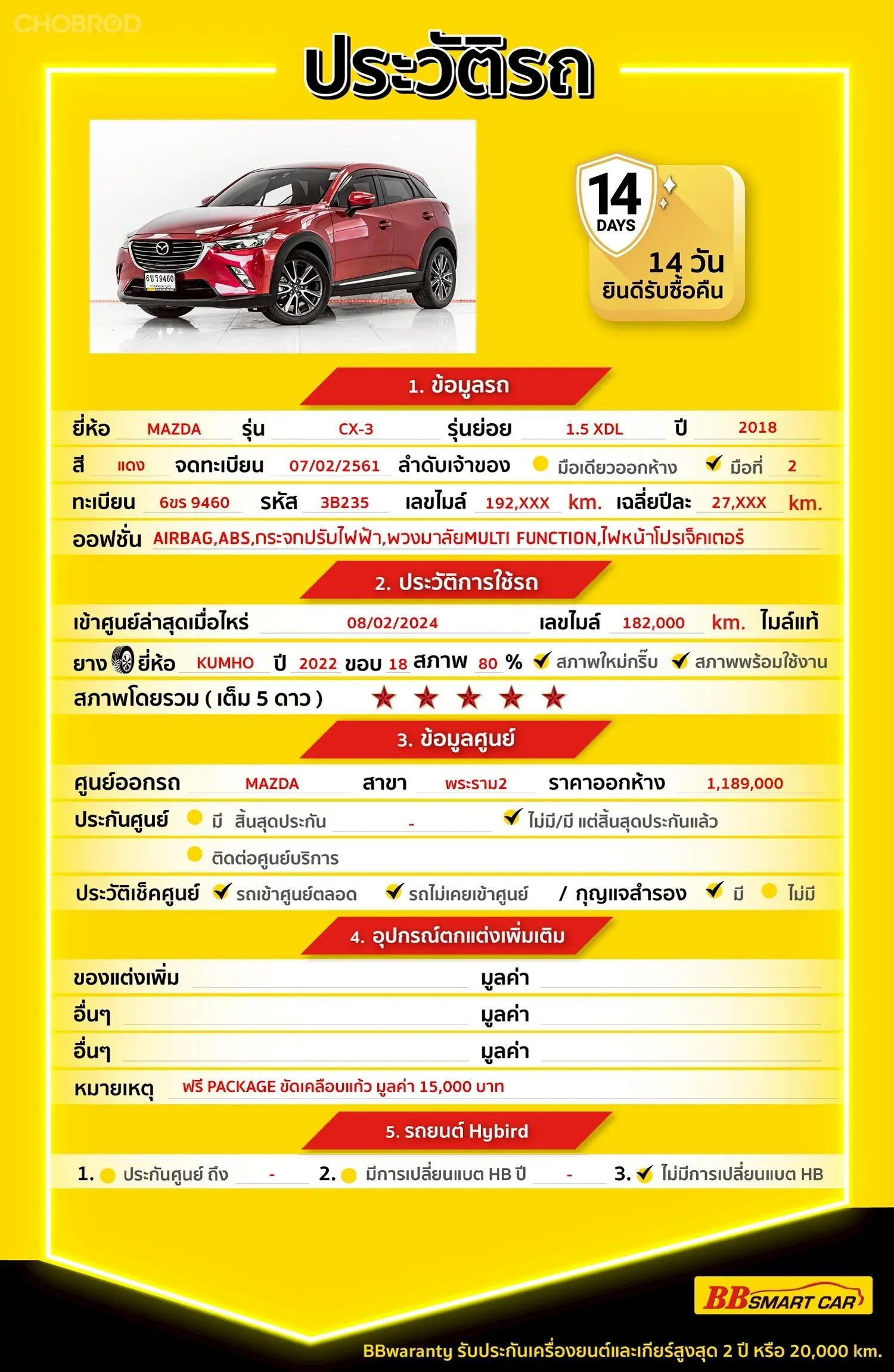 MAZDA CX-3 1.5 XDL AT 2018 ออกรถ 0 บาท จัดได้ 399,000 บ. Line:@bbcar03 🔥 จอง 199 บาท ส่งบัตรประชาชน รู้ผลอนุมัติภายใน 30 นาที ไม่ผ่านคืนเงินจองทุกกรณี 🔥 ซื้อรถกับ BB พร้อมให้คำปรึกษา แก้ทุกปัญหา ให้ทุกเรื่อง บริการ call center 24 ชม. 🔥 BB Care Plus รับประกันหลังการขาย สูงสุด 2 ปี หรือ 20,000 km. 🔥 มีรถให้เลือกมากกว่า 1,800 คัน สาขา 3 ถนนกาญจนาภิเษก ใกล้กับโลตัสบางใหญ่ รหัสรถ 3B235 ราคา 379,000 บ. ผ่อนเพียง 6,512 บ. Brand : MAZDA Year : 2018 Model : CX-3 Grade : 1.5 XDL Engine : 1500 CC. Type : ดีเซล Gearbox : A/T Color : แดง Mileage : 192,xxx km. (ซื้อสด ราคานี้ยังไม่รวมค่าดำเนินการ 10,000 บ.) 🚩 Price : 379,000 บาท ยอดจัด : 389,000 บาท เงินดาวน์ : ฟรีเงินดาวน์ ประกันภัย : ฟรีประกันภัย 1 ปี ค่าดำเนินการ : 10,000 บาท รวมออกรถ : 0 บาท ผ่อน 36 = 12,010 บาท ผ่อน 48 = 9,119 บาท ผ่อน 60 = 8,009 บาท ผ่อน 72 = 7,165 บาท ผ่อน 84 = 6,512 บาท *เงื่อนไขเป็นไปตามที่ไฟแนนซ์กำหนด โปรโมชั่นพิเศษ สำหรับลูกค้าเครดิตดี 🚩เลือกรับเรทดอกเบี้ยพิเศษ 📍36 งวด = 1.29% 📍48 งวด = 1.99% 📍60 งวด = 2.39% 📍72 งวด = 3.59% 🔥 เงื่อนไข โปรโมชั่น ดอกเบี้ยเริ่มต้น 1.29% ตลอดอายุสัญญา - ยอดจัดไฟแนนซ์ 300,000-600,0000 บาท - ผ่อนสูงสุด 72 เดือน - เป็นลูกค้าประวัติดี พนักงานประจำ เงินเดือน 20,000 บาท ขึ้นไป - ค่าดำเนินการแคมเปญ 20,000 บาท (รวมในยอดจัดได้) 🎗Car Hightlight มาแล้วค่ะ MAZDA CX-3 เป็นรถที่ครบครันด้วยอุปกรณ์อำนวยความสะดวกสบาย ตอบโจทย์ทุกการใช้งาน ที่มาพร้อมกับรูปลักษณ์ดีไซน์ภายนอกที่สปอร์ตโฉบเฉี่ยว ภายในสปอร์ตหรูหรา ดูล้ำสมัยมากยิ่งขึ้น สนใจเข้ามาดูตัวรถได้ค่ะ รถสภาพป้ายแดงค่ะ ราคาไม่แพง ไมล์แท้ รถดูแลศูนย์ตลอดค่ะ 🎗ภายใน ภายในสะอาดเรียบร้อย จอ LCD เล่น DVD พวงมาลัยเพาเวอร์ วิทยุ - CD เบรค ABS พวงมาลัย Multifunction เบาะหนัง เบาะหนังแท้ กุญแจรีโมท-สัญญานกันขโมย กระจกไฟฟ้า แอร์ AUTO Cruise Control เซ็นทรัลล๊อก กระจกมองข้างปรับไฟฟ้า แอร์ ไมล์ Digital Airbag 🎗ภายนอก ไม่มีชนหนักหรือพลิกคว่ำค่ะ กระจกมองข้างพับไฟฟ้า ไฟเลี้ยวกระจกมองข้าง ไฟตัดหมอก กล้องส่องหลัง คิ้วกันสาด เซนเซอร์ถอยหลัง ไฟโปรเจคเตอร์ ไฟซีนอน ให้ความโดดเด่นเป็นเอกลักษณ์ของ MAZDA ทดลองขับแล้วช่วงล่างและเครื่องยนต์ยังแน่นค่ะ 🎗ความคุ้มค่า คัดเลือกคันนี้มาแล้วค่ะสภาพดีมากๆ เทียบกับราคานี้ถือว่าคุ้มค่ามากๆค่ะ มาดูรถไม่ผิดหวังแน่นนอนค่ะ ⭐การรับประกันหลังการขาย BB Care Plus สูงสุด 2 ปี หรือ 20,000 km. ด้วยช่างที่ผ่านการอบรมจากศูนย์ชั้นนำของประเทศ 🎉Special offer เฉพาะ บีบีสมาร์ทคาร์ ที่นี่ที่เดียว ⭐ดอกเบี้ยเริ่มต้น 1.29% มีไฟแนนซ์รองรับหลายที่ค่ะ ⭐ฟรี!! แพคเก็จ ขัดเคลือบแก้ว มูลค่า 15,000 บาท ทุกคัน ⭐อนุมัติไว 30 นาที นำเอกสารมาให้ครบรับรถกลับบ้านทันทีค่ะ ⭐BB Care Plus รับประกันหลังการขาย สูงสุด 2 ปี หรือ 20,000 km. ⭐มี 6 สาขา ในกรุงเทพและปริมณฑลใกล้บ้านท่าน ⭐รถทุกคันผ