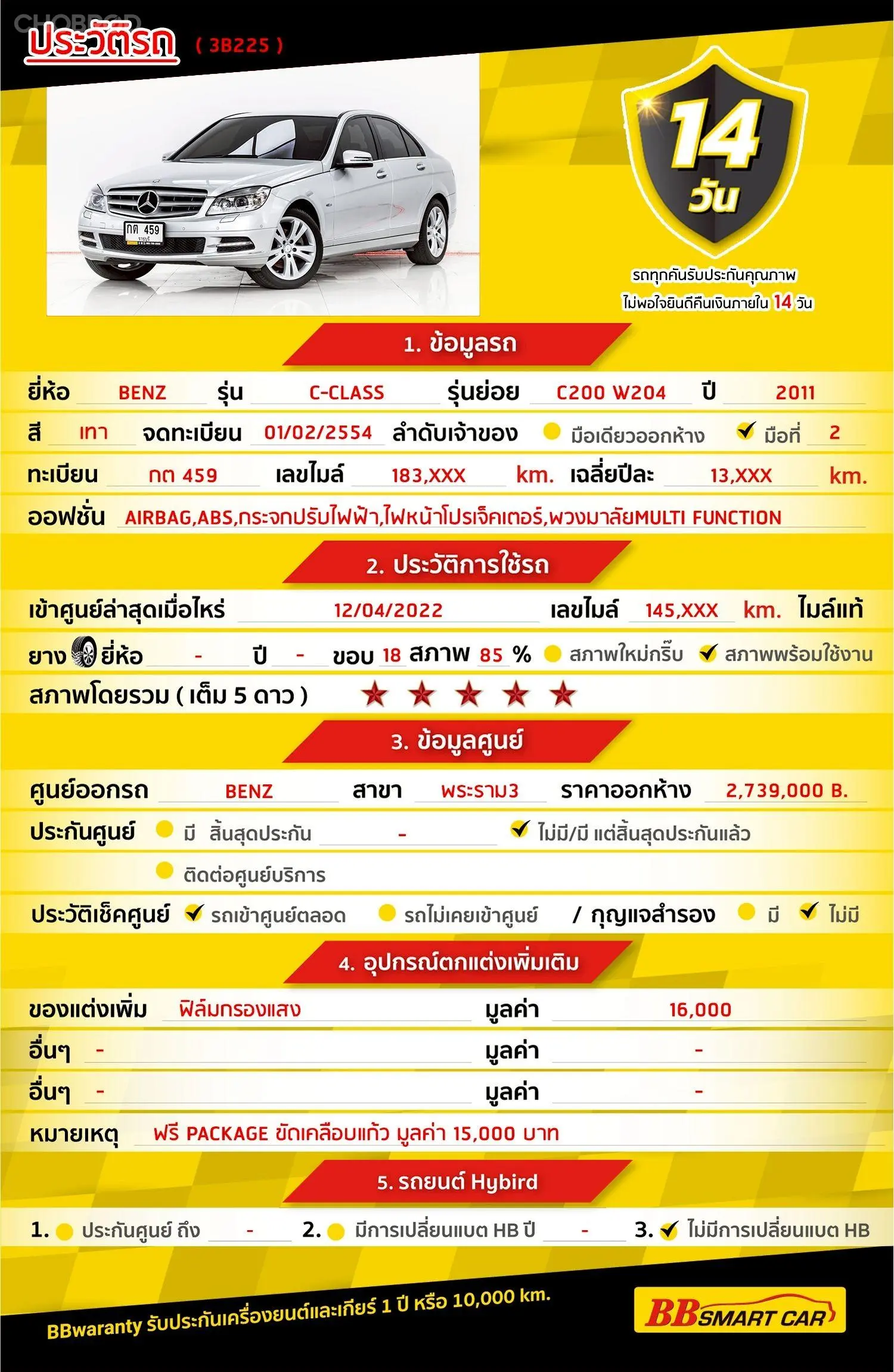 มีการรับประกันจากดีลเลอร์ (6 เดือน) มีบริการช่วยเหลือฉุกเฉินบนท้องถนน 24 ชม. จากดีลเลอร์
