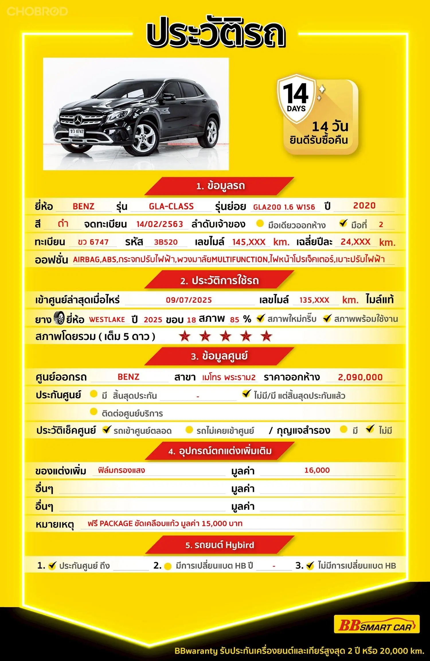 MERCEDES-BENZ GLA-CLASS GLA200 W156 AT 2020 ออกรถ 0 บาท รหัสรถ 3B520 Line: @bbcar03 📍BBsmartcar สาขา 3 ถนนกาญจนาภิเษก ใกล้กับโลตัสบางใหญ่ MERCEDES-BENZ GLA-CLASS GLA200 W156 AT 2020 💸price 669,000 บาท *** Highlight *** GLA-CLASS GLA200 W156 AT ปี 2020 สี Cosmos Black Metallic เป็นรถ COMPACT SUV ยอดนิยม สปอร์ตหรู ระดับพรีเมี่ยม วิ่งเพียง 145,xxx KM. ภายในกว้างขวาง ฟังก์ชั่น อำนวยความสะดวกครบครัน รถประวัติดี ไร้อุบัติเหตุ ดูแลอย่างสม่ำเสมอ ประวัติดี สภาพเหมือนป้ายแดง ประหยัดราคาจากป้ายแดงได้ถึง ล้านกว่าบาท 💎รับประกันโครงสร้างรถ ไม่เคยประสบอุบัติเหตุหนัก พลิกคว่ำ น้ำท่วม หรือไฟไหม้ โครงสร้างและแชสซีอยู่ในสภาพสมบูรณ์ 💎BB Care Plus รับประกันหลังการขายสูงสุด 2 ปี หรือ 20,000 km. 💎ไม่พอใจ ยินดีคืนเงินภายใน 14 วัน NO. 3B520 Brand. : MERCEDES-BENZ Year. : 2020 Model. : GLA-CLASS Grade. : GLA200 W156 Engine. : 1600 CC Type. : เบนซิน Gearbox : AT Color. : สีดำ Mileage. : 145,XXX KM. (ซื้อสด ราคานี้ยังไม่รวมค่าดำเนินการ 10,000 บ.) เงินดาวน์ : 0 บาท ประกันภัย : ฟรีประกันภัย 1 ปี ค่าดำเนินการ : 10,000 บาท รวมออกรถ : 0 บาท ผ่อน 72 งวด = 12,322 บาท ผ่อน 84 งวด = 11,200 บาท จุดเด่นออฟชั่น 1. เครื่องยนต์: เบนซิน 4 สูบแถวเรียง 16 วาล์ว ขนาด 1,595 ซีซี เทอร์โบอินเตอร์คูลเลอร์ 2. กำลังสูงสุด: 156 แรงม้า ที่ 5,300 รอบ/นาที แรงบิดสูงสุด: 250 นิวตันเมตร ที่ 1,250-4,000 รอบ/นาที 3. ความปลอดภัย: ระบบเบรก Adaptive พร้อมฟังก์ชั่น HOLD, ระบบช่วยออกตัวบนทางลาดชัน (Hill Start Assist), ระบบช่วยเตือนอาการเหนื่อยล้า (Attention Assist), โปรแกรมควบคุมการทรงตัวอัตโนมัติ (ESP) 4. การขับเคลื่อน: ขับเคลื่อนล้อหน้า ความเร็วสูงสุด: 215 กม./ชม. 🎗ภายใน เบรกมือไฟฟ้า กระจกไฟฟ้า ไมล์ Digital เบาะหนังแท้ แอร์ AUTO จอ LCD เล่น DVD เกียร์ Paddle Shift แอร์ กุญแจรีโมท-สัญญานกันขโมย เซ็นทรัลล๊อก วิทยุ - CD เบาะไฟฟ้าคู่หน้า Navigator เบรค ABS Cruise Control Airbag กระจกมองข้างปรับไฟฟ้า พวงมาลัย Multifunction พวงมาลัยเพาเวอร์ 🎗ภายนอก ไฟโปรเจคเตอร์ ไฟตัดหมอก กระจกมองข้างพับไฟฟ้า ไฟซีนอน ไฟเลี้ยวกระจกมองข้าง 🎗ความคุ้มค่า สำหรับคันนี้หากเปรียบเทียบราคากับคุณภาพ คันนี้ถือว่าคุ้มค่ามากค่ะ ผ่อนสบายๆก็มีรถขับได้ รถดีมีคุณภาพแบบนี้รีบตัดสินใจซื้อได้เลราคานี้มาไวไปไวนะคะ ⭐️การรับประกันหลังการขาย BB Care Plus สูงสุด 2 ปี หรือ 20,000 km. ด้วยช่างที่ผ่านการอบรมจากศูนย์ชั้นนำของประเทศ 🎉Special offer เฉพาะ บีบีสมาร์ทคาร์ ที่นี่ที่เดียว ⭐ดอกเบี้ยเริ่มต้น 1.29% มีไฟแนนซ์รองรับหลายที่ค่ะ ⭐ฟรี!! แพคเก็จ ขัดเคลือบแก้ว มูลค่า 15,000 บาท ทุกคัน ⭐อนุมัติไว 30 นาที นำเอกสารมาให้ครบรับรถกลับบ้านทันทีค่ะ ⭐มี 6 สาขา ในกรุงเทพและปริมณฑลใกล้บ้านท่าน ⭐รถทุกคันผ่านตรวจสอบ Inspection เรียบร้อยแล้วค่ะ ผ่าน 5 ดาวทุกคันค่ะ ⭐เซลล์ทุกท่านเป็นมืออาชีพพร้อมให้บริการทุกท่านแน่นอนค่ะ ⭐เงื่อนไขเป็นไปตามที่ไฟแนนซ์กำหนด เลือกข้อเสนอที่ให้คุณมากกว