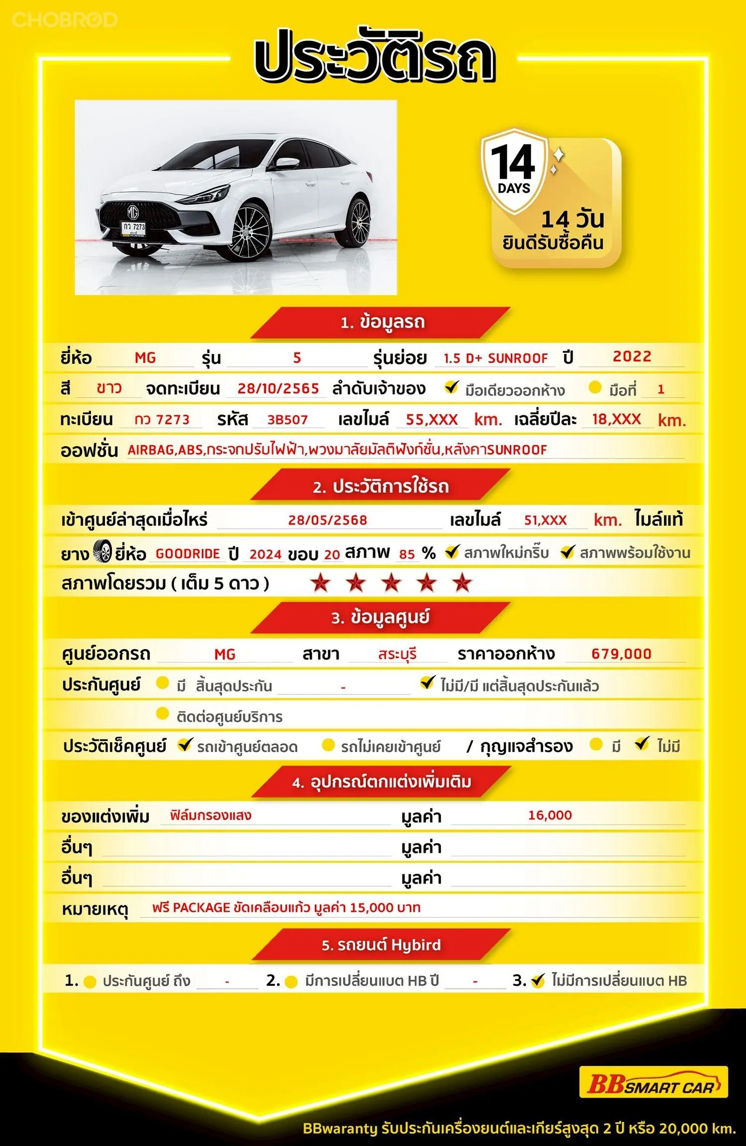 MG 5 1.5 D+ AT 2022 ออกรถ 0 บาท รหัสรถ 3B507 Line: @bbcar03 🔥มีรถให้เลือกมากกว่า 1,800 คัน 🔥รถทุกคันผ่านตรวจสอบ Inspection เรียบแล้วค่ะ ผ่าน 5 ดาวทุกคันค่ะ 🔥ซื้อรถกับ BB พร้อมให้คำปรึกษา แก้ทุกปัญหา ให้ทุกเรื่อง บริการ call center 24 ชม. 🔥BB Care Plus รับประกันหลังการขาย สูงสุด 2 ปี หรือ 20,000 km. 🔥ฟรี!! แพคเก็จ ขัดเคลือบแก้ว มูลค่า 15,000 บาท ทุกคัน 🔥มี 6 สาขา ในกรุงเทพและปริมณฑลใกล้บ้านท่าน สาขา 3 ถนนกาญจนาภิเษก ใกล้กับโลตัสบางใหญ่ รหัสรถ 3B507 ราคา 369,000 บ. ผ่อนเพียง 6,512 บ. Brand : MG Year : 2022 Model : 5 Grade : 1.5 D+ SUNROOF Engine : 1500 CC. Type : เบนซิน Gearbox : A/T Color : ขาว Mileage : 55,xxx km. (ซื้อสด ราคานี้ยังไม่รวมค่าดำเนินการ 10,000 บ.) 🚩 Price 369,000 บาท ยอดจัด : 379,000 บาท เงินดาวน์ : ฟรีเงินดาวน์ ประกันภัย : ฟรีประกันภัย 1 ปี ค่าดำเนินการ : 10,000 บาท รวมออกรถ : 0 บาท ผ่อน 36 งวด = 12,530 บาท ผ่อน 48 งวด = 9,640 บาท ผ่อน 60 งวด = 8,009 บาท ผ่อน 72 งวด = 7,165 บาท ผ่อน 84 งวด = 6,512 บาท *เงื่อนไขเป็นไปตามที่ไฟแนนซ์กำหนด โปรโมชั่นพิเศษ สำหรับลูกค้าเครดิตดี 🚩เลือกรับเรทดอกเบี้ยพิเศษ 📍36 งวด = 1.29% 📍48 งวด = 1.99% 📍60 งวด = 2.39% 📍72 งวด = 3.59% 🔥 เงื่อนไข โปรโมชั่น ดอกเบี้ยเริ่มต้น 1.29% ตลอดอายุสัญญา - ยอดจัดไฟแนนซ์ 300,000-600,0000 บาท - ผ่อนสูงสุด 72 เดือน - เป็นลูกค้าประวัติดี พนักงานประจำ เงินเดือน 20,000 บาท ขึ้นไป - ค่าดำเนินการแคมเปญ 20,000 บาท (รวมในยอดจัดได้) 🎗Car Hightlight รถสวยๆ วันนี้ขอแนะนำ MG 5 ขับง่ายๆในเมืองด้วยเกียร์ AT ภายนอกของรถเป็นสีขาว ดีไซน์สทุกเส้นสายโฉบเฉี่ยวรอบคัน ลงตัวทุกองศา ภายในห้องโดยสารกว้างขวางและมีความสวยงามหรูหรา 🎗ภายใน. สำหรับ MG ZS คันนี้อุปกรณ์ข้างในเหมือนได้มือ1 เลยค่ะ เซ็นทรัลล๊อก แอร์ AUTO เบรกมือไฟฟ้า เบาะไฟฟ้าคนขับ Cruise Control Airbag ไมล์ Digital จอ LCD เล่น DVD Navigator เบาะหนัง พวงมาลัย Multifunction แอร์ วิทยุ - CD เบรค ABS กระจกไฟฟ้า กุญแจรีโมท-สัญญานกันขโมย ซันรูฟ พวงมาลัยเพาเวอร์ 🎗ภายนอก ไม่มีชนหนักหรือพลิกคว่ำค่ะ กระจกมองข้างปรับไฟฟ้า ไฟเลี้ยวกระจกมองข้าง กล้องส่องหลัง กระจกมองข้างพับไฟฟ้า ไฟโปรเจคเตอร์ ไฟซีนอน ไฟตัดหมอก ล้อแม็ก เซนเซอร์ถอยหลัง ให้ความโดดเด่นเป็นเอกลักษณ์ของ MG ทดลองขับแล้วช่วงล่างและเครื่องยนต์ยังแน่นค่ะ 🎗ความคุ้มค่า รถสภาพนี้หายากมากค่ะบอกเลย รถไมล์แท้ อีกด้วย คัดเลือกคันนี้มาแล้วค่ะสภาพดีมากๆ เทียบกับราคานี้ถือว่าคุ้มค่ามากๆค่ะ