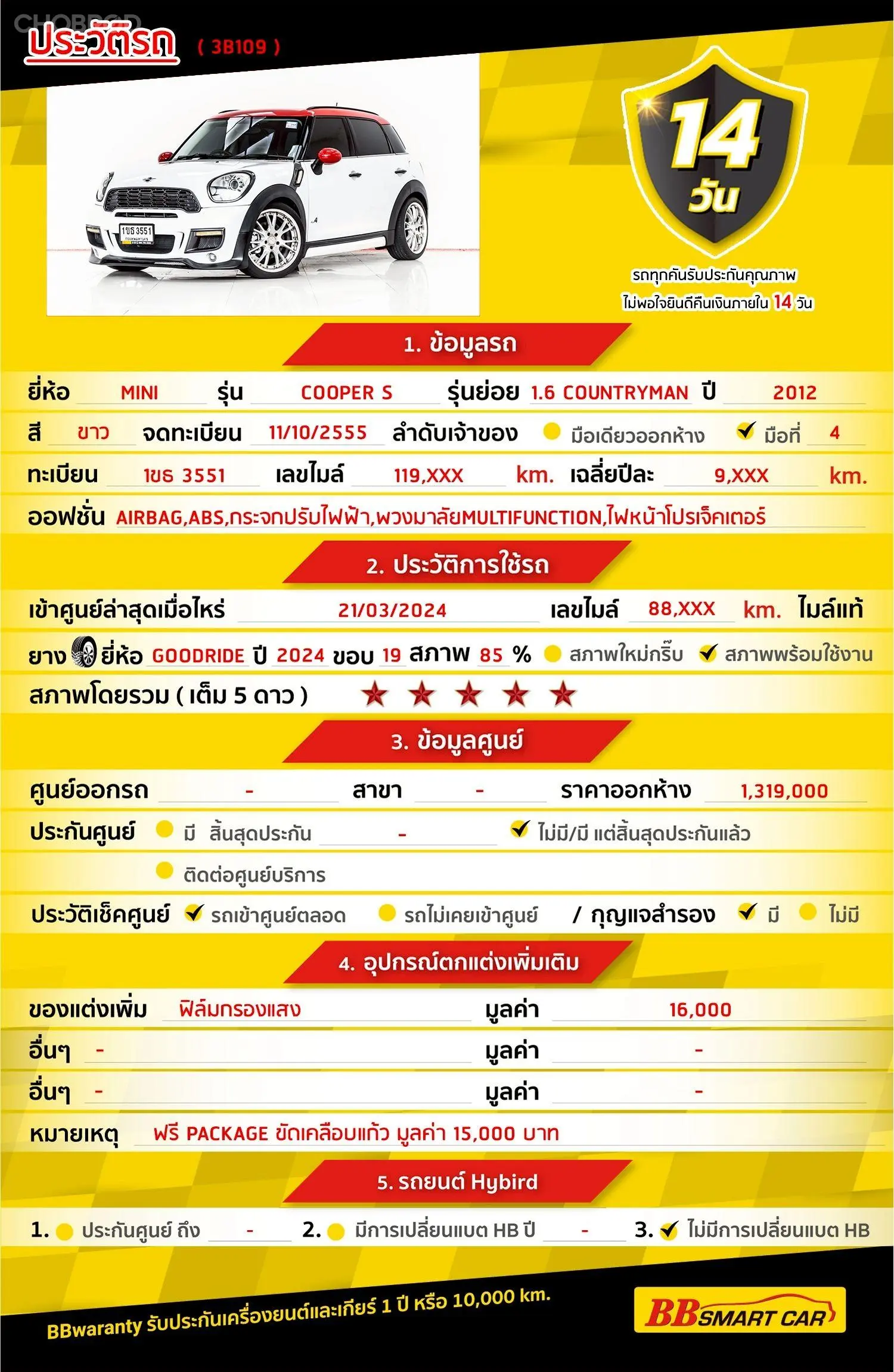MINI COOPER S 1.6 COUNTRYMAN (F56) AT 2012 ออกรถ 0 บาท จัดได้ 439,000 บ. Line:@*******แสดงข้อมูล 🔥จอง 199 บาท ส่งบัตรประชาชน รู้ผลอนุมัติภายใน 30 นาที ไม่ผ่านคืนเงินจองทุกกรณี 🔥 ซื้อรถกับ BB พร้อมให้คำปรึกษา แก้ทุกปัญหา ให้ทุกเรื่อง บริการ call center 24 ชม. 🔥 BB Care Plus รับประกันหลังการขาย สูงสุด 2 ปี หรือ 20,000 km. 🔥 มีรถให้เลือกมากกว่า 1,800 คัน สาขา 3 ถนนกาญจนาภิเษก ใกล้โลตัสบางใหญ่ รหัสรถ 3B109 ราคา 419,000 บ. ผ่อนเพียง 8,528 บ. Brand : MINI Year : 2012 Model : COOPER S Grade : 1.6 COUNTRYMAN (F56) Engine : 1600 cc. Type : เบนซิน Gearbox : A/T Color : ขาว - แดง Mileage : 119,XXX km. (ซื้อสด ราคานี้ยังไม่รวมค่าดำเนินการ 10,000 บ.) 🚩 Price : 419,000 บาท ยอดจัด : 429,000 บาท เงินดาวน์ : ฟรีเงินดาวน์ ประกันภัย : ฟรีประกันภัย 1 ปี ค่าดำเนินการ : 10,000 บาท รวมออกรถ : 0 บาท ผ่อน 36 = 15,103 บาท ผ่อน 48 = 11,841 บาท ผ่อน 60 = 10,178 บาท ผ่อน 72 = 9,068 บาท ผ่อน 84 = 8,526 บาท *เงื่อนไขเป็นไปตามที่ไฟแนนซ์กำหนด โปรโมชั่นพิเศษ สำหรับลูกค้าเครดิตดี 🚩เลือกรับเรทดอกเบี้ยพิเศษ 📍36 งวด = 1.29% 📍48 งวด = 1.99% 📍60 งวด = 2.39% 📍72 งวด = 3.59% 🔥 เงื่อนไข โปรโมชั่น ดอกเบี้ยเริ่มต้น 1.29% ตลอดอายุสัญญา - ยอดจัดไฟแนนซ์ 300,000-600,0000 บาท - ผ่อนสูงสุด 72 เดือน - เป็นลูกค้าประวัติดี พนักงานประจำ เงินเดือน 20,000 บาท ขึ้นไป - ค่าดำเนินการแคมเปญ 20,000 บาท (รวมในยอดจัดได้) 🎗Car Hightlight รถสวยๆ วันนี้ขอแนะนำ MINI COOPER สวยมากค่ะ จัดทรงมาอย่างดี เป็นแบรนด์ในฝันของสาวๆหลายคน คุณผู้ชายก็ขับได้ค่ะ เครื่องยนต์เบนซิน รถสวย สภาพพร้อมใช้งาน 🎗ภายใน Airbag จอ LCD เล่น DVD กระจกไฟฟ้า เซ็นทรัลล๊อก ซันรูฟ กุญแจรีโมท-สัญญานกันขโมย เบรค ABS วิทยุ - CD พวงมาลัยเพาเวอร์ แอร์ AUTO เกียร์ Paddle Shift เบาะหนังแท้ กระจกมองข้างปรับไฟฟ้า แอร์ พวงมาลัย Multifunction Cruise Control 🎗ภายนอก ไม่มีชนหนักหรือพลิกคว่ำค่ะ สภาพดี พร้อมด้วย ไฟซีนอน ไฟโปรเจคเตอร์ เซนเซอร์ถอยหลัง ล้อแม็ก ไฟตัดหมอก กล้องส่องหลัง ดูแลรักษาง่าย แถมช่วงล่างยังแน่นๆ ให้ความโดดเด่นเป็นเอกลักษณ์ของ แบรนด์ MINI ทดลองขับแล้วช่วงล่างและเครื่องยนต์ยังแน่นค่ะ 🎗ความคุ้มค่า รถสภาพนี้หายากมากค่ะบอกเลย รถไมล์แท้อีกด้วย คัดเลือกคันนี้มาแล้วค่ะสภาพดีมากๆ เทียบกับราคานี้ถือว่าคุ้มค่ามากๆค่ะ มาดูรถไม่ผิดหวังแน่นนอนค่ะ ⭐การรับประกันหลังการขาย BB Care Plus สูงสุด 2 ปี หรือ 20,000 km. ด้วยช่างที่ผ่านการอบรมจากศูนย์ชั้นนำของประเทศ 🎉Special offer เฉพาะ บีบีสมาร์ทคาร์ ที่นี่ที่เดียว ⭐ดอกเบี้ยเริ่มต้น 1.29% มีไฟแนนซ์รองรับหลายที่ค่ะ ⭐ฟรี!! แพคเก็จ ขัดเคลือบแก้ว มูลค่า 15,000 บาท ทุกคัน ⭐อนุมัติไว 30 นาที นำเอกสารมาให้ครบรับรถกลับบ้านทันทีค่ะ ⭐BB Care Plus รับประกันหลังการขาย สูงสุด 2 ปี หรือ 20,000 km. ⭐มี 6 สาขา ในกรุงเทพและปริมณฑลใกล้บ้านท่าน ⭐รถทุกคันผ่านตรวจสอบ Inspection เรียบแล้วค่ะ ผ่าน 5 ดาวทุกคันค่ะ ⭐เซลล์ท