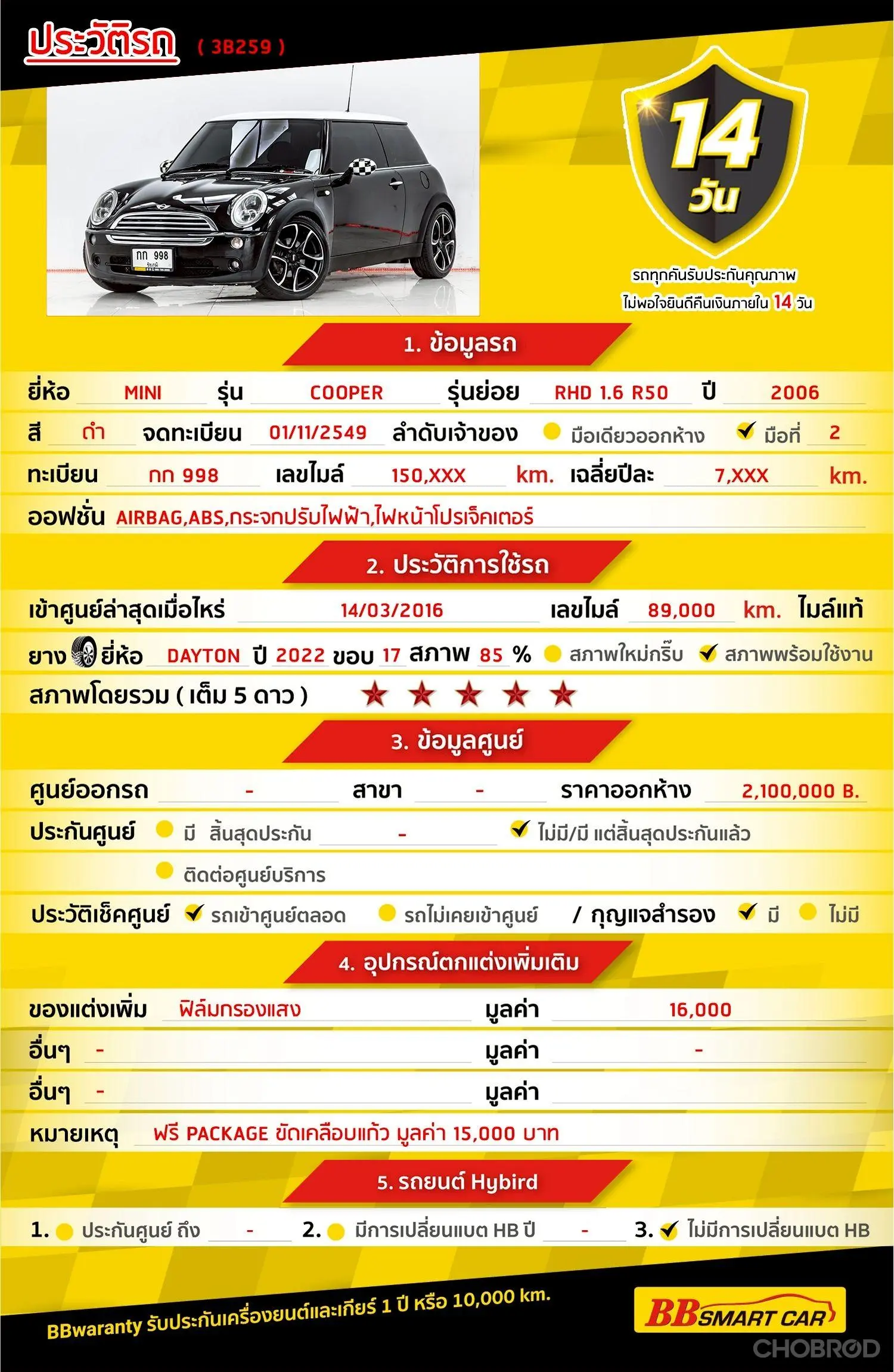 MINI COOPER 1.6 RHD COUPE (R50) AT 2006 ราคา 309,000 บ. (ขายสดเท่านั้น) Line:@bbcar03 🔥 จอง 199 บาท ส่งบัตรประชาชน รู้ผลอนุมัติภายใน 30 นาที ไม่ผ่านคืนเงินจองทุกกรณี 🔥 ซื้อรถกับ BB พร้อมให้คำปรึกษา แก้ทุกปัญหา ให้ทุกเรื่อง บริการ call center 24 ชม. 🔥 BB Care Plus รับประกันหลังการขาย สูงสุด 2 ปี หรือ 20,000 km. 🔥 มีรถให้เลือกมากกว่า 1,800 คัน สาขา 3 ถ.กาญจนาภิเษก ใกล้กับโลตัสบางใหญ่ รหัสรถ 3B259 ราคา 309,000 บ. (ขายสดเท่านั้น) Brand : MINI Year : 2006 Model : COOPER Grade : 1.6 RHD COUPE (R50) Engine : 1600 cc. Type : เบนซิน Gearbox : AT Color : ดำ-ขาว Mileage : 150,xxx km. (ซื้อสด ราคานี้ยังไม่รวมค่าดำเนินการ 10,000 บ.) 🚩 Price. 309,000 บาท ค่าดำเนินการ : 10,000 *เงื่อนไขเป็นไปตามที่ไฟแนนซ์กำหนด 🎗Car Hightlight รถสวยๆ วันนี้ขอแนะนำ MINI COOPER สวยมากค่ะ จัดทรงมาอย่างดี เป็นแบรนด์ในฝันของสาวๆหลายคน คุณผู้ชายก็ขับได้ค่ะ เครื่องยนต์เบนซิน รถสวย สภาพพร้อมใช้งาน 🎗ภายใน ภายในสะอาดเรียบร้อย มาพร้อมกับแอร์เย็นๆ มี เซ็นทรัลล๊อก แอร์ กระจกไฟฟ้า Airbag พวงมาลัยเพาเวอร์ แอร์ AUTO กระจกมองข้างปรับไฟฟ้า กุญแจรีโมท-สัญญานกันขโมย เบาะหนังแท้ เบรค ABS วิทยุ - CD 🎗ภายนอก ไม่มีชนหนักหรือพลิกคว่ำ น้ำท่วม กระจกมองข้างพับไฟฟ้า เซนเซอร์ถอยหลัง ไฟซีนอน ไฟตัดหมอก ไฟโปรเจคเตอร์ ตัวรถสี ดำ-ขาว รถดูแลรักษาง่าย แถมช่วงล่างยังแน่นๆ ให้ความโดดเด่นเป็นเอกลักษณ์ของ MINI ทดลองขับแล้วช่วงล่างและเครื่องยนต์ยังแน่นค่ะ 🎗ความคุ้มค่า สำหรับใครที่กำลังมองหารถใหม่ลองเข้ามาดู ประหยัดเงินไปเยอะมาก ใช้งานสะดวกสบาย ประหยัดน้ำมันมากๆ เทียบกับราคานี้ถือว่าคุ้มค่ามากๆ ทีมงานทำราคาที่ดีที่สุด เหมาะสมกับสภาพรถ เทียบกับสเปคเดียวกัน รับประกันเราขายถูกกว่าแน่นอน ⭐การรับประกันหลังการขาย BB Care Plus สูงสุด 2 ปี หรือ 20,000 km. ด้วยช่างที่ผ่านการอบรมจากศูนย์ชั้นนำของประเทศ 🎉Special offer เฉพาะ บีบีสมาร์ทคาร์ ที่นี่ที่เดียว ⭐ดอกเบี้ยเริ่มต้น 1.29% มีไฟแนนซ์รองรับหลายที่ค่ะ ⭐ฟรี!! แพคเก็จ ขัดเคลือบแก้ว มูลค่า 15,000 บาท ทุกคัน ⭐อนุมัติไว 30 นาที นำเอกสารมาให้ครบรับรถกลับบ้านทันทีค่ะ ⭐BB Care Plus รับประกันหลังการขาย สูงสุด 2 ปี หรือ 20,000 km. ⭐มี 6 สาขา ในกรุงเทพและปริมณฑลใกล้บ้านท่าน ⭐รถทุกคันผ่านตรวจสอบ Inspection เรียบแล้วค่ะ ผ่าน 5 ดาวทุกคันค่ะ ⭐เซลล์ทุกท่านเป็นมืออาชีพพร้อมให้บริการทุกท่านแน่นอนค่ะ เลือกข้อเสนอที่ให้คุณมากกว่าที่อื่น เพราะเราเล็งเห็นแล้ว ที่บีบีสมาร์ทคาร์ ให้คุณได้มากกว่าที่อื่นแน่นอนค่ะ มาที่เดียวจบทุกปัญหา หลากหลายรุ่นให้เลือกกับบริการที่คุณต้องประทับใจแน่นอนค่ะ