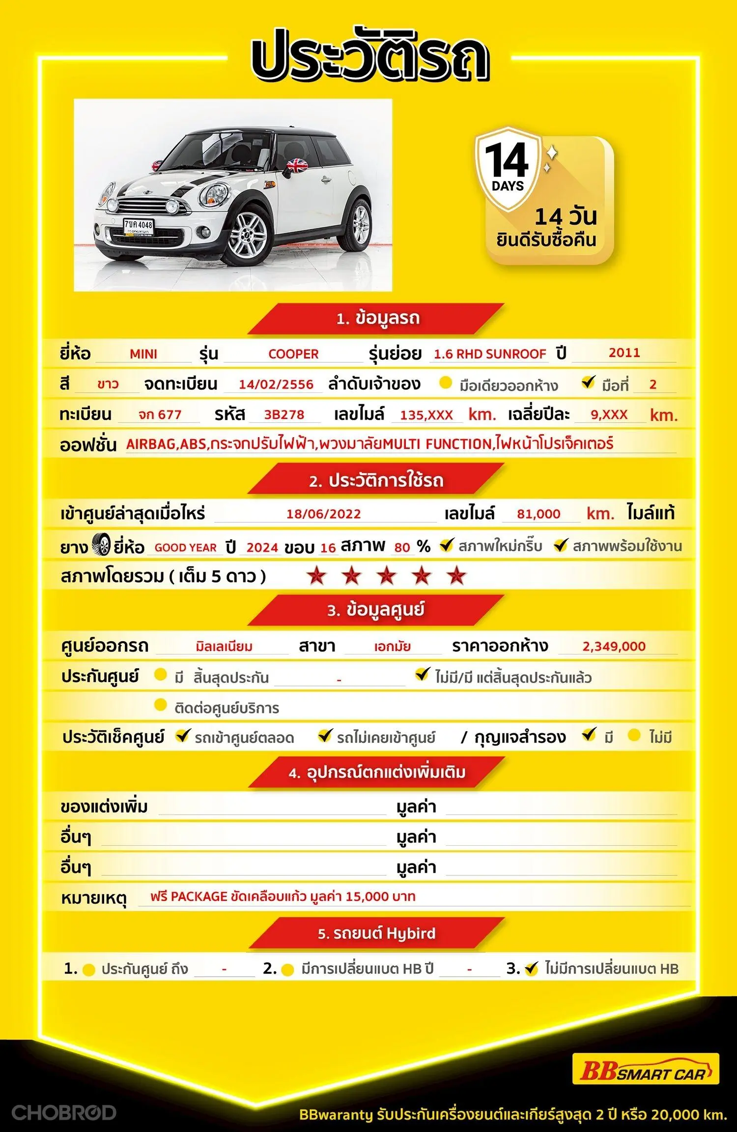 มีการรับประกันจากดีลเลอร์ (6 เดือน) มีบริการช่วยเหลือฉุกเฉินบนท้องถนน 24 ชม. จากดีลเลอร์