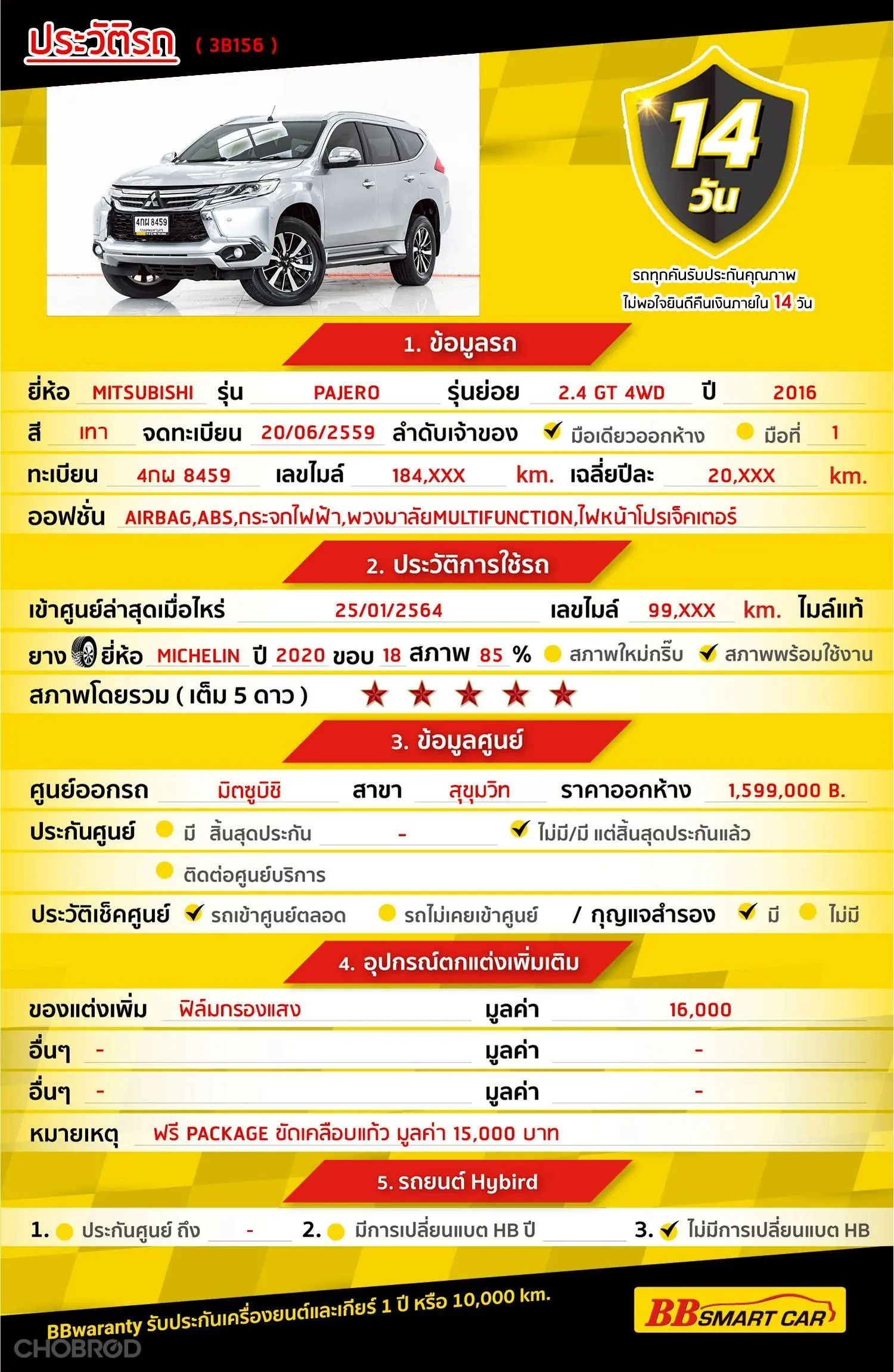 MITSUBISHI PAJERO SPORT 2.4 GT AT 2016 ออกรถ 0 บาท จัดได้ 559,000 บ. Line:@*******แสดงข้อมูล 🔥 จอง 199 บาท ส่งบัตรประชาชน รู้ผลอนุมัติภายใน 30 นาที ไม่ผ่านคืนเงินจองทุกกรณี 🔥 ซื้อรถกับ BB พร้อมให้คำปรึกษา แก้ทุกปัญหา ให้ทุกเรื่อง บริการ call center 24 ชม. 🔥 BB Care Plus รับประกันหลังการขาย สูงสุด 2 ปี หรือ 20,000 km. 🔥 มีรถให้เลือกมากกว่า 1,800 คัน สาขา 3 ถนนกาญจนาภิเษก ใกล้โลตัสบางใหญ่ รหัสรถ 3B156 ราคา 539,000 บ. ผ่อนเพียง 9,876 บ. Brand. : MITSUBISHI Year : 2016 Model. : PAJERO SPORT Grade. : 2.4 GT Engine. : 2400 Type. : ดีเซล Gearbox : AT4WD Color. : เทา Mileage. : 184,xxx km. (ซื้อสด ราคานี้ยังไม่รวมค่าดำเนินการ 10,000 บ.) 🚩 Price. 539,000 บาท ยอดจัด : 549,000 บาท เงินดาวน์. : 0 บาท ประกันภัย : ฟรีประกันภัย 1 ปี ค่าดำเนินการ : 10,000 บาท รวมออกรถ : 0 บาท ผ่อน 36 = 18,222 บาท ผ่อน 48 = 14,142 บาท ผ่อน 60 = 11,792 บาท ผ่อน 72 = 10,602 บาท ผ่อน 84 = 9,876 บาท *เงื่อนไขเป็นไปตามที่ไฟแนนซ์กำหนด โปรโมชั่นพิเศษ สำหรับลูกค้าเครดิตดี 🚩เลือกรับเรทดอกเบี้ยพิเศษ 📍36 งวด = 1.29% 📍48 งวด = 1.99% 📍60 งวด = 2.39% 📍72 งวด = 3.59% 🔥 เงื่อนไข โปรโมชั่น ดอกเบี้ยเริ่มต้น 1.29% ตลอดอายุสัญญา - ยอดจัดไฟแนนซ์ 300,000-600,0000 บาท - ผ่อนสูงสุด 72 เดือน - เป็นลูกค้าประวัติดี พนักงานประจำ เงินเดือน 20,000 บาท ขึ้นไป - ค่าดำเนินการแคมเปญ 20,000 บาท (รวมในยอดจัดได้) 🎗 Car Hightlight รถสวยๆ วันนี้ขอแนะนำ MITSUBISHI PAJERO รถครอบครัว 7 ที่นั่ง ภายในมีพื้นที่กว้างขวาง ตัวเครื่องจากศูนย์เดิม ใหม่เอี่ยมมากค่ะ 🎗 ภายใน. ห้องโดยสารขนาดใหญ่ เซ็นทรัลล๊อก Cruise Control แอร์ แอร์ราว เกียร์ Paddle Shift ไมล์ Digital วิทยุ - CD Navigator เบรค ABS พวงมาลัย Multifunction กุญแจรีโมท-สัญญานกันขโมย กระจกมองข้างปรับไฟฟ้า Airbag กระจกไฟฟ้า พวงมาลัยเพาเวอร์ เบาะไฟฟ้าคู่หน้า เบาะหนังแท้ เบรกมือไฟฟ้า จอ LCD เล่น DVD แอร์ AUTO พื้นที่ภายในผู้โดยสารกว้างขวางมากค่ะ เหมาะแก่การครอบครองมากค่ะ 🎗 ภายนอก ไม่มีชนหนักหรือพลิกคว่ำค่ะ กระจกมองข้างพับไฟฟ้า ไฟโปรเจคเตอร์ เซนเซอร์รอบคัน กล้องส่องหลัง บันไดข้าง กระจกข้างโครเมี่ยม ไฟตัดหมอก ไฟซีนอน ไฟเลี้ยวกระจกมองข้าง ดูแลรักษาง่าย แถมช่วงล่างยังแน่นๆ ให้ความโดดเด่นเป็นเอกลักษณ์ของ MITSUBISHI PAJERO ทดลองขับแล้วช่วงล่างและเครื่องยนต์ยังแน่นค่ะ 🎗ความคุ้มค่า หากคุณกำลังมองหารถที่มีประสิทธิภาพดี ราคาไม่แพง รถคันนี้จะตอบโจทย์คุณได้ดีที่สุด สามารถรองรับผู้โดยสารและบรรทุกของได้เป็นอย่างดีเลยครับ ⭐การรับประกันหลังการขาย BB Care Plus สูงสุด 2 ปี หรือ 20,000 km. ด้วยช่างที่ผ่านการอบรมจากศูนย์ชั้นนำของประเทศ 🎉Special offer เฉพาะ บีบีสมาร์ทคาร์ ที่นี่ที่เดียว ⭐ดอกเบี้ยเริ่มต้น 1.29% มีไฟแนนซ์รองรับหลายที่ค่ะ ⭐ฟรี!! แพคเก็จ ขัดเคลือบแก้ว มูลค่า 15,000 บาท ทุกคัน ⭐อนุมัติไว 30 นาที นำเอกสารมาให้ครบรับรถกลับบ้านทันทีค่ะ ⭐BB Care Plus รับประกันหลังการขาย ส