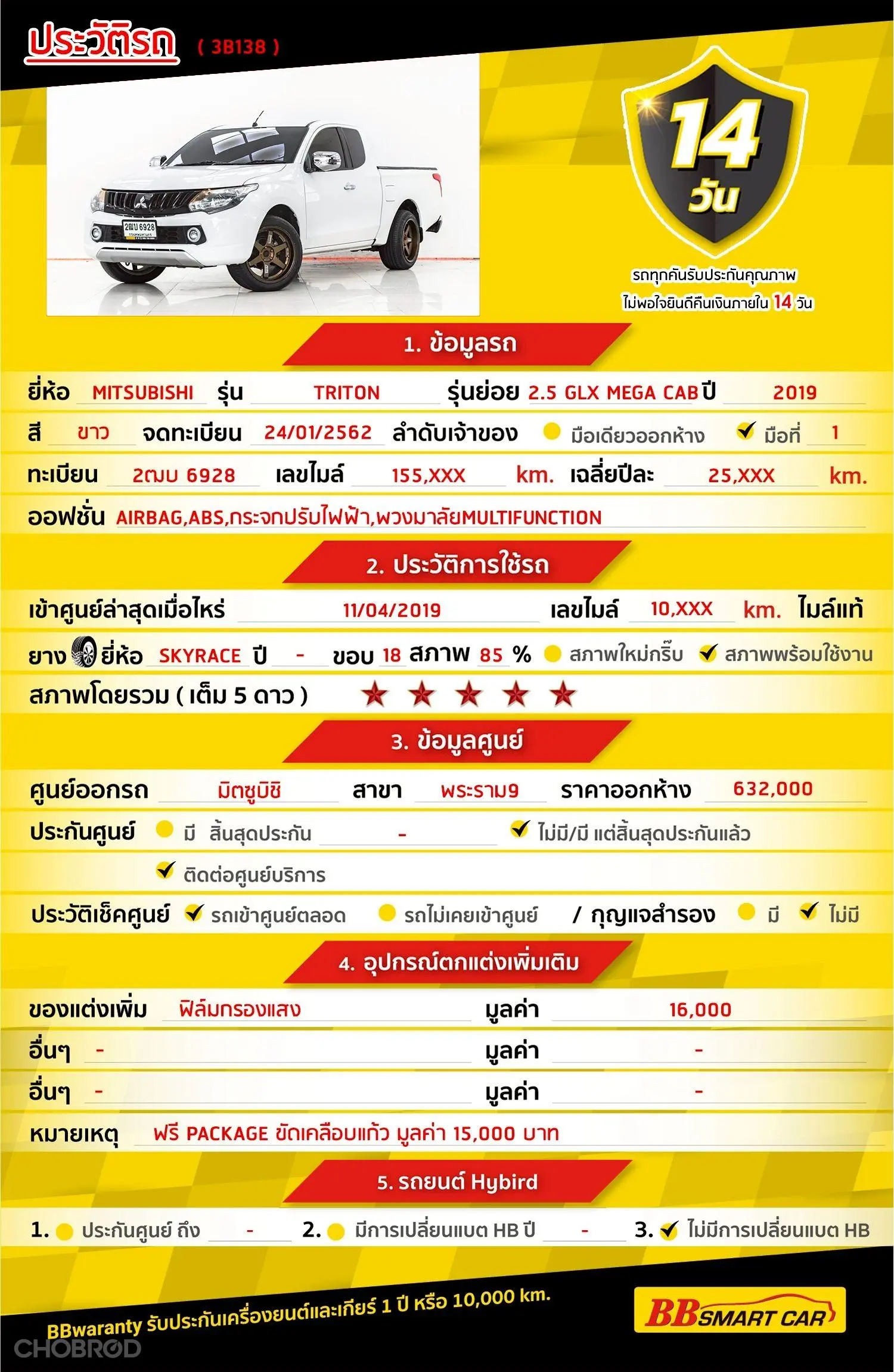 มีการรับประกันจากดีลเลอร์ (6 เดือน) มีบริการช่วยเหลือฉุกเฉินบนท้องถนน 24 ชม. จากดีลเลอร์