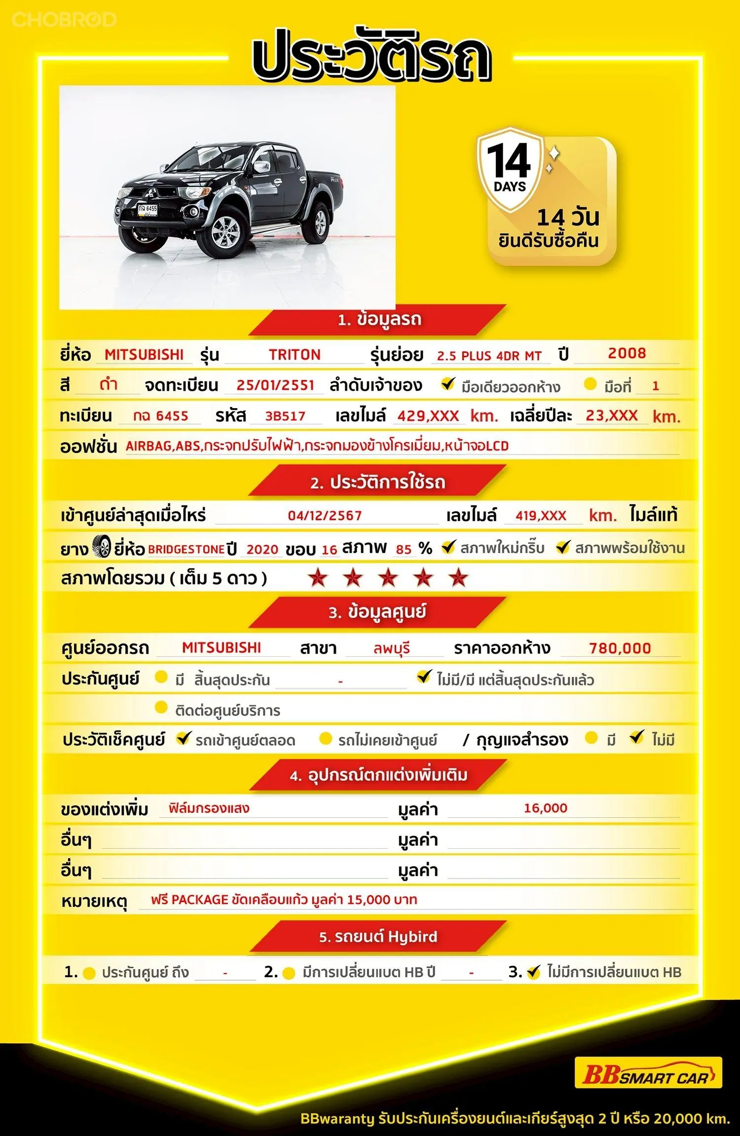 MITSUBISHI TRITON 2.5 PLUS DOUBLE CAB MT 2008 ขายสดเท่านั้น รหัสรถ 3B517 Line: @*******แสดงข้อมูล 🔥มีรถให้เลือกมากกว่า 1,800 คัน 🔥รถทุกคันผ่านตรวจสอบ Inspection เรียบแล้วค่ะ ผ่าน 5 ดาวทุกคันค่ะ 🔥ซื้อรถกับ BB พร้อมให้คำปรึกษา แก้ทุกปัญหา ให้ทุกเรื่อง บริการ call center 24 ชม. 🔥BB Care Plus รับประกันหลังการขาย สูงสุด 2 ปี หรือ 20,000 km. 🔥ฟรี!! แพคเก็จ ขัดเคลือบแก้ว มูลค่า 15,000 บาท ทุกคัน 🔥มี 6 สาขา ในกรุงเทพและปริมณฑลใกล้บ้านท่าน สาขา 3 ถนนกาญจนาภิเษก ใกล้กับโลตัสบางใหญ่ รหัสรถ 3B517 ราคา 169,000 บ. (ขายสดเท่านั้น) Brand : MITSUBISHI Year : 2008 Model : TRITON Grade : 2.5 PLUS DOUBLE CAB Engine : 2500 CC. Type : ดีเซล Gearbox : MT Color : สีดำ Mileage : 429,xxx km. (ซื้อสด ราคานี้ยังไม่รวมค่าดำเนินการ 10,000 บ.) 🚩 Price : 169,000 บาท (ขายสดเท่านั้น) ค่าดำเนินการ : 10,000 *เงื่อนไขเป็นไปตามที่ไฟแนนซ์กำหนด 🎗Car Hightlight มาแล้วค่ะ MITSUBISHI TRITON เป็นรถที่มุ่งเน้นความประหยัดพลังงาน แต่มีสมรรถนะที่แรงขึ้น แรงบิดดีขึ้น รวมถึงการบำรุงรักษาที่ง่าย รถสภาพป้ายแดงค่ะ ราคาไม่แพง ไมล์แท้ รถดูแลศูนย์ตลอดค่ะ 🎗ภายใน กระจกมองข้างปรับไฟฟ้า วิทยุ - CD กระจกไฟฟ้า Airbag เบาะหนัง เบรค ABS พวงมาลัยเพาเวอร์ แอร์ กุญแจรีโมท-สัญญานกันขโมย จอ LCD เล่น DVD Navigator 🎗ภายนอก ไม่มีชนหนักหรือพลิกคว่ำค่ะ กระจกข้างโครเมี่ยม บันไดข้าง แม็กลายเนอร์ ไฟตัดหมอก ไฟซีนอน คิ้วกันสาด ให้ความโดดเด่นเป็นเอกลักษณ์ของ ์MITSUBISHI ทดลองขับแล้วช่วงล่างและเครื่องยนต์ยังแน่นค่ะ
