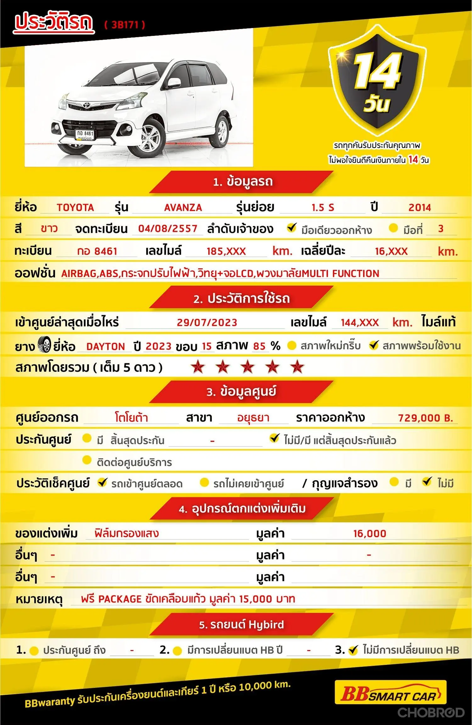 TOYOTA AVANZA 1.5 S AT 2014 ออกรถ 0 บาท จัดได้ 269,000 บ. Line:@*******แสดงข้อมูล 🔥 จอง 199 บาท ส่งบัตรประชาชน รู้ผลอนุมัติภายใน 30 นาที ไม่ผ่านคืนเงินจองทุกกรณี 🔥 ซื้อรถกับ BB พร้อมให้คำปรึกษา แก้ทุกปัญหา ให้ทุกเรื่อง บริการ call center 24 ชม. 🔥 BB Care Plus รับประกันหลังการขาย สูงสุด 2 ปี หรือ 20,000 km. 🔥 มีรถให้เลือกมากกว่า 1,800 คัน สาขา 3 ถนนกาญจนาภิเษก ใกล้โลตัสบางใหญ่ รหัสรถ 3B171 ราคา 249,000 บ. ผ่อนเพียง 4,916 บ. Brand : TOYOTA Year : 2014 Model : AVANZA Grade : 1.5 S Engine : 1500 cc. Type : เบนซิน Gearbox : A/T Color : ขาว Mileage : 185,XXX km. (ซื้อสด ราคานี้ยังไม่รวมค่าดำเนินการ 10,000 บ.) 🚩 Price 249,000 บาท ยอดจัด : 259,000 บาท เงินดาวน์ : ฟรีเงินดาวน์ ประกันภัย : ฟรีประกันภัย 1 ปี ค่าดำเนินการ : 10,000 บาท รวมออกรถ : 0 บาท ผ่อน 36 = 8,622 บาท ผ่อน 48 = 6,6 97บาท ผ่อน 60 = 5,889 บาท ผ่อน 72 = 5,234 บาท ผ่อน 84 = 4,916 บาท *เงื่อนไขเป็นไปตามที่ไฟแนนซ์กำหนด โปรโมชั่นพิเศษ สำหรับลูกค้าเครดิตดี 🚩เลือกรับเรทดอกเบี้ยพิเศษ 📍36 งวด = 1.29% 📍48 งวด = 1.99% 📍60 งวด = 2.39% 📍72 งวด = 3.59% 🔥 เงื่อนไข โปรโมชั่น ดอกเบี้ยเริ่มต้น 1.29% ตลอดอายุสัญญา - ยอดจัดไฟแนนซ์ 300,000-600,0000 บาท - ผ่อนสูงสุด 72 เดือน - เป็นลูกค้าประวัติดี พนักงานประจำ เงินเดือน 20,000 บาท ขึ้นไป - ค่าดำเนินการแคมเปญ 20,000 บาท (รวมในยอดจัดได้) 🎗Car Hightlight รถสวยๆ วันนี้ขอแนะนำ AVANZA ปี 2014 ดูดีแบบมีสไตล์ ห้องโดยสารภายในใช้วัสดุดูหรูหราและทนทาน ทั้งยังให้ความรู้สึกทันสมัย โฉบเฉี่ยว เน้นให้ห้องโดยสารดูโออ่าและกว้างขวางตัวล้อเดิมจากศูนย์ รถไม่มีชนหนัก ไม่น้ำท่วมหายหายแน่นอนคะ 🎗ภายใน. วิทยุ - CD กระจกมองข้างปรับไฟฟ้า พวงมาลัยเพาเวอร์ แอร์ราว จอ LCD เล่น DVD Airbag กุญแจรีโมท-สัญญานกันขโมย เบรค ABS กระจกไฟฟ้า เบาะหนังแท้ แอร์ พวงมาลัย Multifunction เซ็นทรัลล๊อก พื้นที่ภายในผู้โดยสารกว้างขวางนั่งได้ไม่อึดอัดแน่นอนค่ะ เหมาะแก่การครอบครองมากคะ 🎗ภายนอก. สีขาวสวยมากค่ะ ไม่มีชนหนักหรือพลิกคว่ำค่ะ กล้องส่องหลัง กระจกมองข้างพับไฟฟ้า ไฟตัดหมอก คิ้วกันสาด ไฟซีนอน ให้ความโดดเด่นเป็นเอกลักษณ์ของ TOYOTA AVANZA ทดลองขับแล้วช่วงล่างและเครื่องยนต์ยังแน่นค่ะ 🎗ความคุ้มค่า รถสภาพนี้หายากมากค่ะบอกเลย รถไมล์แท้อีกด้วย คัดเลือกคันนี้มาแล้วค่ะสภาพดีมากๆ เทียบกับราคานี้ถือว่าคุ้มค่ามากๆค่ะ มาดูรถไม่ผิดหวังแน่นนอนค่ะ ⭐การรับประกันหลังการขาย BB Care Plus สูงสุด 2 ปี หรือ 20,000 km. ด้วยช่างที่ผ่านการอบรมจากศูนย์ชั้นนำของประเทศ 🎉Special offer เฉพาะ บีบีสมาร์ทคาร์ ที่นี่ที่เดียว ⭐ดอกเบี้ยเริ่มต้น 1.29% มีไฟแนนซ์รองรับหลายที่ค่ะ ⭐ฟรี!! แพคเก็จ ขัดเคลือบแก้ว มูลค่า 15,000 บาท ทุกคัน ⭐อนุมัติไว 30 นาที นำเอกสารมาให้ครบรับรถกลับบ้านทันทีค่ะ ⭐BB Care Plus รับประกันหลังการขาย สูงสุด 2 ปี หรือ 20,000 km. ⭐มี 6 สาขา ในกรุงเทพและปริมณ