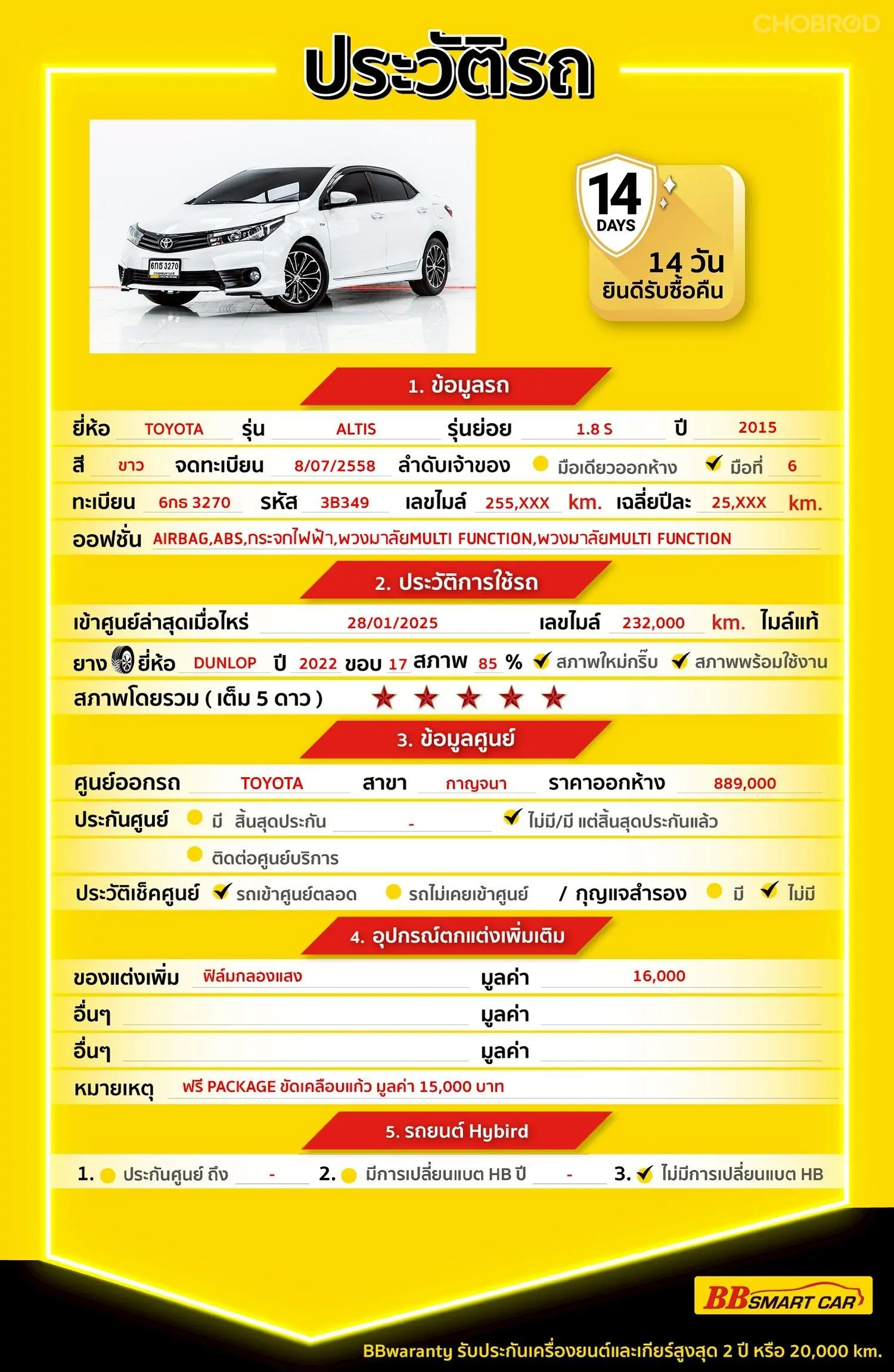 มีการรับประกันจากดีลเลอร์ (6 เดือน) มีบริการช่วยเหลือฉุกเฉินบนท้องถนน 24 ชม. จากดีลเลอร์