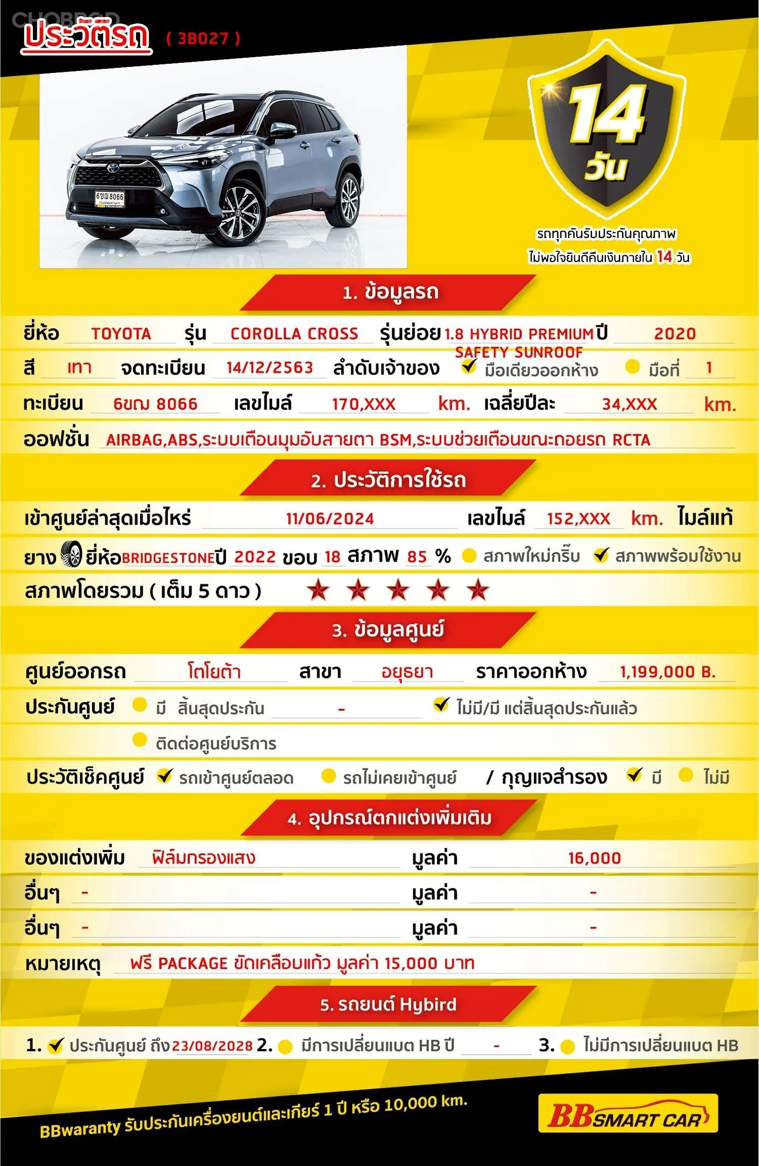 TOYOTA COROLLA CROSS 1.8 HYBRID PREMIUM SAFETY AT 2020 ออกรถ 0 บาท จัดได้ 679,000 บ. Line:@**********แสดงข้อมูล 🔥 จอง 199 บาท ส่งบัตรประชาชน รู้ผลอนุมัติภายใน 30 นาที ไม่ผ่านคืนเงินจองทุกกรณี 🔥 ซื้อรถกับ BB พร้อมให้คำปรึกษา แก้ทุกปัญหา ให้ทุกเรื่อง บริการ call center 24 ชม. 🔥 BB Care Plus รับประกันหลังการขาย สูงสุด 2 ปี หรือ 20,000 km. 🔥 มีรถให้เลือกมากกว่า 1,600 คัน สาขา 3 ถนนกาญจนาภิเษก ใกล้โลตัสบางใหญ่ รหัสรถ 3B027 ราคา 659,000 บ. ผ่อนเพียง 11,284 บ. Brand : TOYOTA Year : 2020 Model : COROLLA CROSS Grade : 1.8 HYBRID PREMIUM SAFETY SUNROOF Engine : 1800 cc. Type : เบนซิน-ไฟฟ้า Gearbox : A/T Color : เทา Mileage : 170,XXX km. (ซื้อสด ราคานี้ยังไม่รวมค่าดำเนินการ 10,000 บ.) 🚩 Price 659,000 บาท ยอดจัด : 669,000 บาท เงินดาวน์ : ฟรีเงินดาวน์ ประกันภัย : ฟรีประกันภัย 1 ปี ค่าดำเนินการ : 10,000 บาท รวมออกรถ : 0 บาท ผ่อน 36 = 22,515 บาท ผ่อน 48 = 17,321 บาท ผ่อน 60 = 14,392 บาท ผ่อน 72 = 12,875 บาท ผ่อน 84 = 11,284 บาท *เงื่อนไขเป็นไปตามที่ไฟแนนซ์กำหนด โปรโมชั่นพิเศษ สำหรับลูกค้าเครดิตดี 🚩เลือกรับเรทดอกเบี้ยพิเศษ 📍36 งวด = 1.29% 📍48 งวด = 1.99% 📍60 งวด = 2.39% 📍72 งวด = 3.59% 🔥 เงื่อนไข โปรโมชั่น ดอกเบี้ยเริ่มต้น 1.29% ตลอดอายุสัญญา - ยอดจัดไฟแนนซ์ 300,000-600,0000 บาท - ผ่อนสูงสุด 72 เดือน - เป็นลูกค้าประวัติดี พนักงานประจำ เงินเดือน 20,000 บาท ขึ้นไป - ค่าดำเนินการแคมเปญ 20,000 บาท (รวมในยอดจัดได้) 🎗Car Hightlight รถสวยๆ วันนี้ขอแนะนำ TOYOTA COROLLA CROSS รูปโฉมที่ดูหรูหราระดับพรี่เมียม นวัตกรรมใหม่แห่งดีไซน์ ออกแบบเพื่อตอบทุกความต้องการของคนทั้งโลก 🎗ภายใน ภายในห้องโดยสารสีดำ เบาะสีแดง จุดเด่นออฟชั่น 1 : พวงมาลัย Muiltifunction 2 : ไมล์ Digital 3 : เบาะหนังแท้ 4 : จอแสดงข้อมูลการขับขี่ขนาด 7 นิ้ว กุญแจรีโมท-สัญญานกันขโมย เซ็นทรัลล๊อก Cruise Control Navigator 🎗ภายนอก กระจังหน้าสีดำเงา กระจกมองข้างปรับ-พับอัตโนมัติ ไฟตัดหมอก ไฟซีนอน กล้องส่องหลัง เซนเซอร์ถอยหลัง ไฟเลี้ยวกระจกมองข้าง ไฟโปรเจคเตอร์ กล้องส่องหลัง กระจกมองข้างพับไฟฟ้า 🎗ความคุ้มค่า จากรูปโฉมที่ดูหรูหราระดับพรี่เมียม คัดเลือกคันนี้มาแล้วค่ะสภาพดีมากๆ เทียบกับราคานี้ถือว่าคุ้มค่ามากๆค่ะ มาดูรถไม่ผิดหวังแน่นนอนค่ะ ⭐การรับประกันหลังการขาย BB Care Plus สูงสุด 2 ปี หรือ 20,000 km. ด้วยช่างที่ผ่านการอบรมจากศูนย์ชั้นนำของประเทศ 🎉Special offer เฉพาะ บีบีสมาร์ทคาร์ ที่นี่ที่เดียว ⭐ดอกเบี้ยเริ่มต้น 1.29% มีไฟแนนซ์รองรับหลายที่ค่ะ ⭐ฟรี!! แพคเก็จ ขัดเคลือบแก้ว มูลค่า 15,000 บาท ทุกคัน ⭐อนุมัติไว 30 นาที นำเอกสารมาให้ครบรับรถกลับบ้านทันทีค่ะ ⭐BB Care Plus รับประกันหลังการขาย สูงสุด 2 ปี หรือ 20,000 km. ⭐มี 6 สาขา ในกรุงเทพและปริมณฑลใกล้บ้านท่าน ⭐รถทุกคันผ่านตรวจสอบ Inspection เรียบแล้วค่ะ ผ่าน 5 ดาวทุกคันค่ะ ⭐เซลล์ทุกท่านเป็นมืออาชีพพร้อมให้บริการทุกท่านแน่นอนค่ะ เลือกข้อเสนอที่ให้คุณมากกว่าที่อื่น 