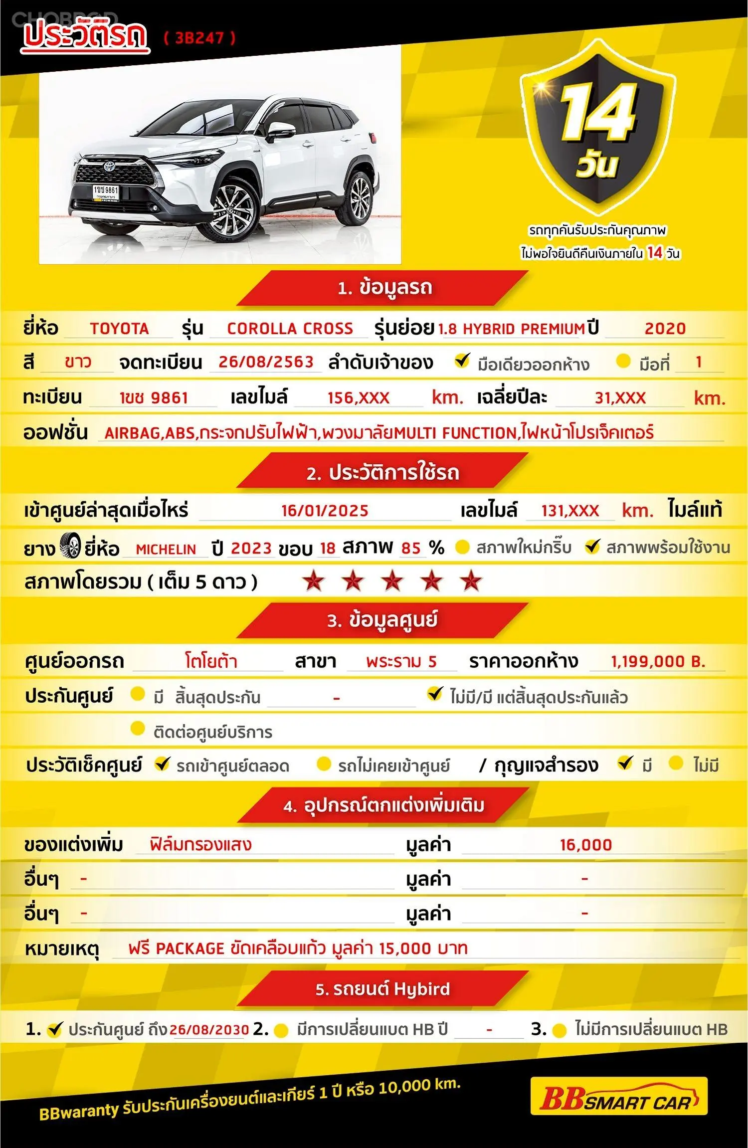 TOYOTA COROLLA CROSS 1.8 HYBRID PREMIUM AT 2020 ออกรถ 0 บาท จัดได้ 629,000 บ. Line:@bbcar03 🔥 จอง 199 บาท ส่งบัตรประชาชน รู้ผลอนุมัติภายใน 30 นาที ไม่ผ่านคืนเงินจองทุกกรณี 🔥 ซื้อรถกับ BB พร้อมให้คำปรึกษา แก้ทุกปัญหา ให้ทุกเรื่อง บริการ call center 24 ชม. 🔥 BB Care Plus รับประกันหลังการขาย สูงสุด 2 ปี หรือ 20,000 km. 🔥 มีรถให้เลือกมากกว่า 1,800 คัน สาขา 3 ถ.กาญจนาภิเษก ใกล้กับโลตัสบางใหญ่ รหัสรถ 3B247 ราคา 609,000 บ. ผ่อนเพียง 10,531 บ. Brand : TOYOTA Year : 2020 Model : COROLLA CROSS Grade : 1.8 HYBRID PREMIUM Engine : 1800 cc. Type : เบนซิน - ไฟฟ้า Gearbox : A/T Color : ขาว Mileage : 156,XXX km. (ซื้อสด ราคานี้ยังไม่รวมค่าดำเนินการ 10,000 บ.) 🚩 Price 609,000 บาท ยอดจัด : 619,000 บาท เงินดาวน์ : ฟรีเงินดาวน์ ประกันภัย : ฟรีประกันภัย 1 ปี ค่าดำเนินการ : 10,000 บาท รวมออกรถ : 0 บาท ผ่อน 36 = 20,260 บาท ผ่อน 48 = 15,587 บาท ผ่อน 60 = 12,950 บาท ผ่อน 72 = 11,586 บาท ผ่อน 84 = 10,531 บาท *เงื่อนไขเป็นไปตามที่ไฟแนนซ์กำหนด โปรโมชั่นพิเศษ สำหรับลูกค้าเครดิตดี 🚩เลือกรับเรทดอกเบี้ยพิเศษ 📍36 งวด = 1.29% 📍48 งวด = 1.99% 📍60 งวด = 2.39% 📍72 งวด = 3.59% 🔥 เงื่อนไข โปรโมชั่น ดอกเบี้ยเริ่มต้น 1.29% ตลอดอายุสัญญา - ยอดจัดไฟแนนซ์ 300,000-600,0000 บาท - ผ่อนสูงสุด 72 เดือน - เป็นลูกค้าประวัติดี พนักงานประจำ เงินเดือน 20,000 บาท ขึ้นไป - ค่าดำเนินการแคมเปญ 20,000 บาท (รวมในยอดจัดได้) 🎗Car Hightlight รถสวยๆ วันนี้ขอแนะนำ TOYOTA COROLLA CROSS รูปโฉมที่ดูหรูหราระดับพรี่เมียม นวัตกรรมใหม่แห่งดีไซน์ ออกแบบเพื่อตอบทุกความต้องการของคนทั้งโลก 🎗ภายใน ภายในห้องโดยสารสีดำ Airbag กระจกมองข้างปรับไฟฟ้า วิทยุ - CD Navigator เซ็นทรัลล๊อก ไมล์ Digital เบรกมือไฟฟ้า จอ LCD เล่น DVD Cruise Control พวงมาลัย Multifunction กุญแจรีโมท-สัญญานกันขโมย เบาะหนังแท้ พวงมาลัยเพาเวอร์ กระจกไฟฟ้า แอร์ เบรค ABS แอร์ AUTOl 🎗ภายนอก ตัวรถเป็นสีขาว โครงสร้างแข็งแรงทนทาน ไฟโปรเจคเตอร์ คิ้วกันสาด ไฟตัดหมอก ไฟซีนอน ไฟเลี้ยวกระจกมองข้าง กระจกมองข้างพับไฟฟ้า กล้องส่องหลัง 🎗ความคุ้มค่า. จากรูปโฉมที่ดูหรูหราระดับพรี่เมียม คัดเลือกคันนี้มาแล้วค่ะสภาพดีมากๆ เทียบกับราคานี้ถือว่าคุ้มค่ามากๆค่ะ มาดูรถไม่ผิดหวังแน่นนอนค่ะ ⭐การรับประกันหลังการขาย BB Care Plus สูงสุด 2 ปี หรือ 20,000 km. ด้วยช่างที่ผ่านการอบรมจากศูนย์ชั้นนำของประเทศ 🎉Special offer เฉพาะ บีบีสมาร์ทคาร์ ที่นี่ที่เดียว ⭐ดอกเบี้ยเริ่มต้น 1.29% มีไฟแนนซ์รองรับหลายที่ค่ะ ⭐ฟรี!! แพคเก็จ ขัดเคลือบแก้ว มูลค่า 15,000 บาท ทุกคัน ⭐อนุมัติไว 30 นาที นำเอกสารมาให้ครบรับรถกลับบ้านทันทีค่ะ ⭐BB Care Plus รับประกันหลังการขาย สูงสุด 2 ปี หรือ 20,000 km. ⭐มี 6 สาขา ในกรุงเทพและปริมณฑลใกล้บ้านท่าน ⭐รถทุกคันผ่านตรวจสอบ Inspection เรียบแล้วค่ะ ผ่าน 5 ดาวทุกคันค่ะ ⭐เซลล์ทุกท่านเป็นมืออาชีพพร้อมให้บริการทุกท่านแน่นอนค่ะ เลือกข้อเสนอที่ให้คุณมากกว่าที่อื่น เพราะเราเ
