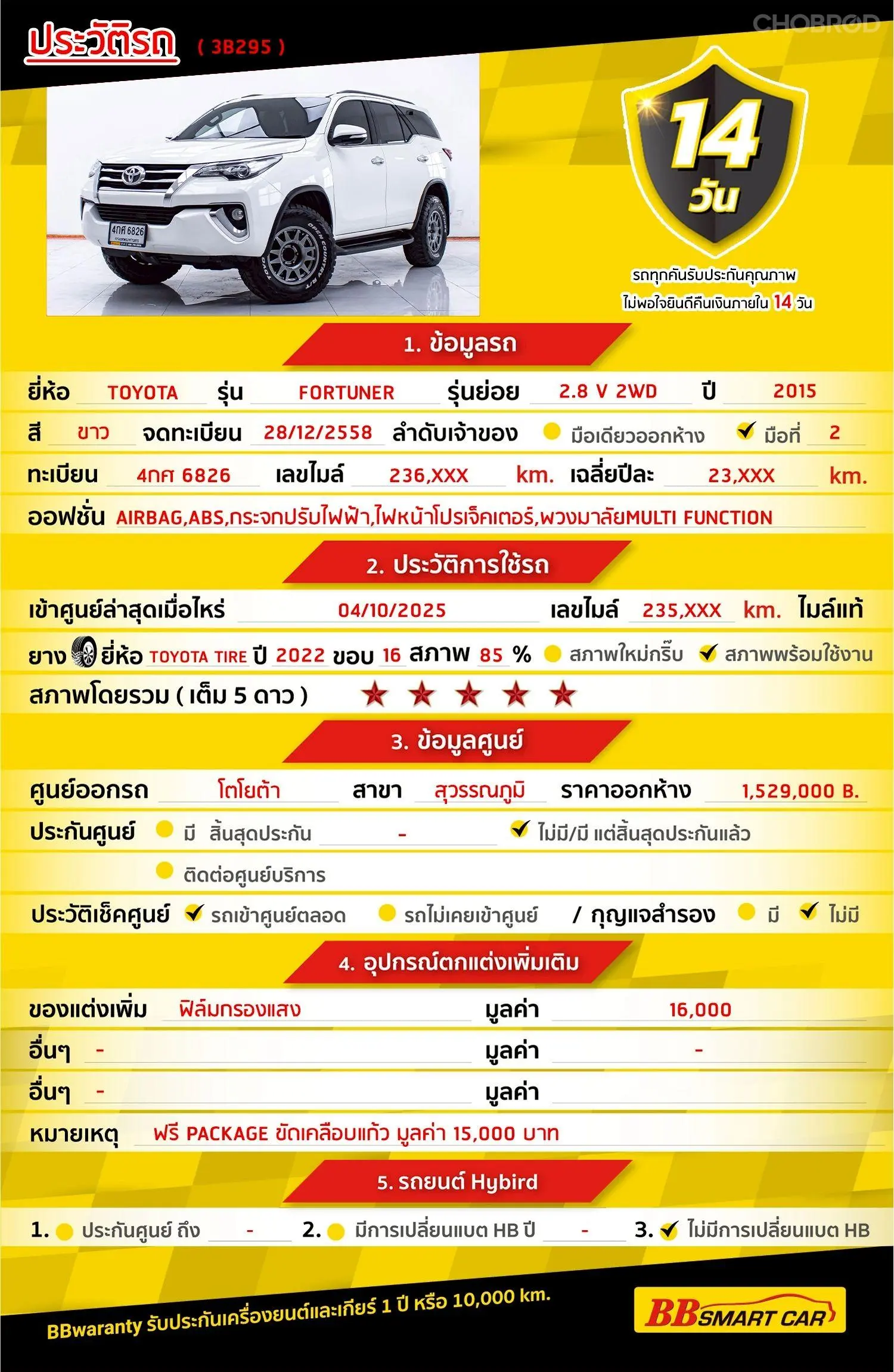 TOYOTA FORTUNER 2.8 V AT 2015 ออกรถ 0 บาท จัดได้ 719,000 บ. Line:@*******แสดงข้อมูล 🔥จอง 199 บาท ส่งบัตรประชาชน รู้ผลพิจารณาภายใน 30 นาที ไม่ผ่านคืนเงินจองทุกกรณี 🔥ซื้อรถกับ BB พร้อมให้คำปรึกษา แก้ทุกปัญหา ให้ทุกเรื่อง บริการ call center 24 ชม. 🔥BB Care Plus รับประกันหลังการขาย สูงสุด 2 ปี หรือ 20,000 km.. 🔥มีรถให้เลือกมากกว่า 1,800 คัน สาขา 3 ถนนกาญจนาภิเษก ใกล้กับโลตัสบางใหญ่ รหัสรถ 3B295 ราคา 699,000 บาท ผ่อนเพียง 12,754 บาท Brand. : TOYOTA Year. : 2015 Model. : FORTUNER Grade. : 2.8 V Engine. : 2800 CC Type. : ดีเซล Gearbox : AT Color. : ขาว Mileage. : 236,XXX KM. (ซื้อสด ราคานี้ยังไม่รวมค่าดำเนินการ 10,000 บ.) 🚩 Price. 699,000 บาท ยอดจัด : 709,000 บาท เงินดาวน์ : 0 บาท ประกันภัย : ฟรีประกันภัย 1 ปี ค่าดำเนินการ : 10,000 บาท รวมออกรถ : 0 บาท ผ่อน 36 งวด = 23,533 บาท ผ่อน 48 งวด = 18,264 บาท ผ่อน 60 งวด = 15,229 บาท ผ่อน 72 งวด = 13,691 บาท ผ่อน 84 งวด = 12,754 บาท เงื่อนไขเป็นไปตามที่ไฟแนนซ์กำหนด โปรโมชั่นพิเศษ สำหรับลูกค้าเครดิตดีลือกรับเรทดอกเบี้ยพิเศษ 🚩เลือกรับเรทดอกเบี้ยพิเศษ 📍36 งวด = 1.29 % 📍48 งวด = 1.99 % 📍60 งวด = 2.39 % 📍72 งวด = 3.59 % 🔥 เงื่อนไข โปรโมชั่น ดอกเบี้ยเริ่มต้น 1.29% ตลอดอายุสัญญา - ยอดจัดไฟแนนซ์ 300,000-600,000 บาท - ผ่อนสูงสุด 72 เดือน - เป็นลูกค้าประวัติดี พนักงานประจำเงินเดือน 20,000 ขึ้นไป - ค่าดำเนินการแคมเปญ 20,000 บาท (รวมในยอดจัดได้) 🎗Car Hightlight รถสวยๆ วันนี้ขอแนะนำ TOYOTA FORTUNER ีสวยหรูมาพร้อมกับเอกลักษณ์โดดเด่นดูทันสมัย แต่แฝงไปด้วยความสปอร์ต ภายในมีห้องโดยสารที่กว้างขวาง ทำความสะอาดได้ง่าย สะดวกสบาย ทั้งภายในและภายนอก คันนี้เหมือนได้มือ1 เลยค่ะ ตัวเครื่องจากศูนย์เดิม รถไม่ชนหนักไม่น้ำท่วมหายห่วงค่ะ 🎗ภายใน Airbag เบรค ABS Cruise Control กระจกไฟฟ้า พวงมาลัย Multifunction จอ LCD เล่น DVD กุญแจรีโมท-สัญญานกันขโมย วิทยุ - CD เบาะหนัง แอร์ เซ็นทรัลล๊อก 🎗ภายนอก ชุดโคมไฟหน้า Bi-Beam LED โปรเจคเตอร์ - เสารับสัญญาณวิทยุดีไซน์ล้ำแบบ Shark Fin - กระจกมองข้างพร้อมไฟเลี้ยว และระบบ Welcome Light - ล้ออัลลอย 18 นิ้ว - ราวหลังคา - ไฟท้าย LED แบบ Light Guidin ไฟโปรเจคเตอร์ - กล้องส่องหลัง - บันไดข้าง 🎗ความคุ้มค่า สำหรับคันนี้หากเปรียบเทียบราคากับคุณภาพ คันนี้ถือว่าคุ้มค่ามากค่ะ ผ่อนสบายๆก็มีรถขับได้ รถดีมีคุณภาพแบบนี้รีบตัดสินใจซื้อได้เลราคานี้มาไวไปไวนะคะ ⭐️การรับประกันหลังการขาย BB Care Plus สูงสุด 2 ปี หรือ 20,000 km. ด้วยช่างที่ผ่านการอบรมจากศูนย์ชั้นนำของประเทศ 🎉Special offer เฉพาะ บีบีสมาร์ทคาร์ ที่นี่ที่เดียว ⭐ดอกเบี้ยเริ่มต้น 1.29% มีไฟแนนซ์รองรับหลายที่ค่ะ ⭐ฟรี!! แพคเก็จ ขัดเคลือบแก้ว มูลค่า 15,000 บาท ทุกคัน ⭐อนุมัติไว 30 นาที นำเอกสารมาให้ครบรับรถกลับบ้านทันทีค่ะ ⭐BB Care Plus รับประกันหลังการขาย สูงสุด 2 ปี หรือ 20,000 km. ⭐มี 6 สาขา ในกรุงเทพและปริมณฑลใกล้บ้านท่าน ⭐รถทุกคันผ่านตรวจสอบ Inspection เรียบร้