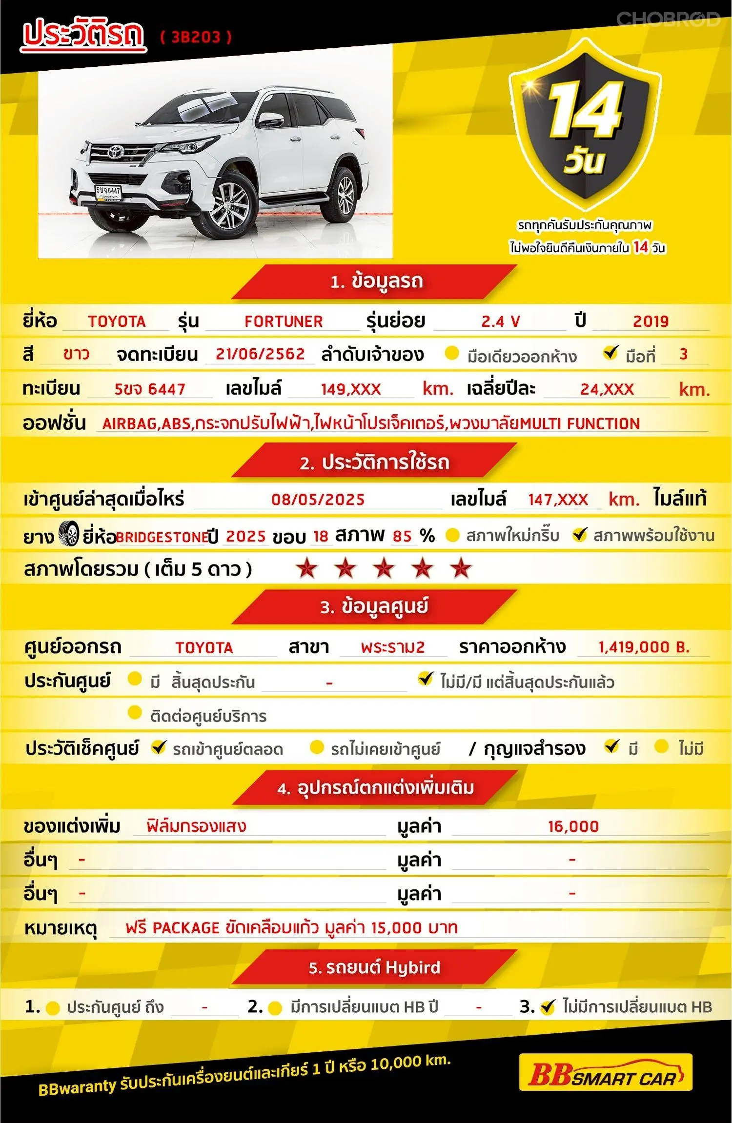 TOYATA FORTUNER 2.4 V AT 2019 ออกรถ 0 บาท จัดได้ 769,000 บ. Line:@*******แสดงข้อมูล 🔥 จอง 199 บาท ส่งบัตรประชาชน รู้ผลอนุมัติภายใน 30 นาที ไม่ผ่านคืนเงินจองทุกกรณี 🔥 ซื้อรถกับ BB พร้อมให้คำปรึกษา แก้ทุกปัญหา ให้ทุกเรื่อง บริการ call center 24 ชม. 🔥 BB Care Plus รับประกันหลังการขาย สูงสุด 2 ปี หรือ 20,000 km. 🔥 มีรถให้เลือกมากกว่า 1,800 คัน บีบี3 สาขาบางใหญ่ (ใกล้โลตัสบางใหญ่) รหัสรถ 3B203 ราคา 859,000 บ. ผ่อนเพียง 12,707 บ. Brand : TOYOTA Year : 2019 Model : FORTUNER Grade : 2.4 V Engine : 2400 CC. Type : ดีเซล Gearbox : AT Color : ขาว Mileage : 149,xxx km. (ซื้อสด ราคานี้ยังไม่รวมค่าดำเนินการ 10,000 บ.) 🎗 Price 859,000 บาท ยอดจัด : 869,000 บาท เงินดาวน์ : ฟรีเงินดาวน์ ประกันภัย : ฟรีประกันภัย 1 ปี ค่าดำเนินการ : 10,000 บาท รวมออกรถ : 0 บาท ผ่อน 36 = 24,447 บาท ผ่อน 48 = 18,807 บาท ผ่อน 60 = 15,626 บาท ผ่อน 72 = 13,980 บาท ผ่อน 84 = 12,707 บาท *เงื่อนไขเป็นไปตามที่ไฟแนนซ์กำหนด โปรโมชั่นพิเศษ สำหรับลูกค้าเครดิตดี 🚩เลือกรับเรทดอกเบี้ยพิเศษ 📍36 งวด = 1.29% 📍48 งวด = 1.99% 📍60 งวด = 2.39% 📍72 งวด = 3.59% 🔥 เงื่อนไข โปรโมชั่น ดอกเบี้ยเริ่มต้น 1.29% ตลอดอายุสัญญา - ยอดจัดไฟแนนซ์ 300,000-600,0000 บาท - ผ่อนสูงสุด 72 เดือน - เป็นลูกค้าประวัติดี พนักงานประจำ เงินเดือน 20,000 บาท ขึ้นไป - ค่าดำเนินการแคมเปญ 20,000 บาท (รวมในยอดจัดได้) 🎗Car Hightlight TOYOTA FORTUNER เครื่อง 2400 cc. เกียร์ออโต้ รถยนต์เอนกประสงค์ นั่งสบายถึง 7 ที่นั่ง พร้อมเทคโนโลยีเพื่อความปลอดภัยและเป็นรถยนต์อเนกประสงค์ มาพร้อมเทคโนโลยีล้ำสมัย 🎗ภายใน ภายในกว้างขวาง สวยหรูโดนใจสุดๆ มาพร้อมเทคโนโลยีอำนวยความสะดวกมากมาย กุญแจรีโมท-สัญญานกันขโมย แอร์ ไมล์ Digital แอร์ AUTO แอร์ราว พวงมาลัยเพาเวอร์ เบรค ABS กระจกไฟฟ้า วิทยุ - CD Airbag Navigator จอ LCD เล่น DVD เบาะไฟฟ้าคู่หน้า Cruise Control พวงมาลัย Multifunction เกียร์ Paddle Shift เบาะหนังแท้ เซ็นทรัลล๊อก 🎗ภายนอก ตัวรถสีขาว ดูเท่เรียบหรูดูแพง พร้อม Option กล้องส่องหลัง ไฟโปรเจคเตอร์ ไฟตัดหมอก บันไดข้าง กันชนแต่ง กระจกมองข้างพับไฟฟ้า ไฟเลี้ยวกระจกมองข้าง ไฟซีนอน เซนเซอร์ถอยหลังตัวรถดูแข็งแรงทนทานสุดๆ 🎗ความคุ้มค่า สำหรับใครที่กำลังมองหารถใหม่ลองเข้ามาดู ประหยัดเงินไปเยอะมาก ใช้งานสะดวกสบาย ประหยัดน้ำมันมากๆ เทียบกับราคานี้ถือว่าคุ้มค่ามากๆ ทีมงานทำราคาที่ดีที่สุดเหมาะสมกับสภาพรถเทียบกับสเปคเดียวกันรับประกันเราขายถูกกว่าแน่นอน ⭐การรับประกันหลังการขาย BB Care Plus สูงสุด 2 ปี หรือ 20,000 km. ด้วยช่างที่ผ่านการอบรมจากศูนย์ชั้นนำของประเทศ 🎉Special offer เฉพาะ บีบีสมาร์ทคาร์ ที่นี่ที่เดียว ⭐ดอกเบี้ยเริ่มต้น 1.29% มีไฟแนนซ์รองรับหลายที่ค่ะ ⭐ฟรี!! แพคเก็จ ขัดเคลือบแก้ว มูลค่า 15,000 บาท ทุกคัน ⭐อนุมัติไว 30 นาที นำเอกสารมาให้ครบรับรถกลับบ้านทันทีค่ะ ⭐BB Care Plus รับประกันหลังการขาย สูงสุด 2 ปี หรือ 20,000 km. ⭐มี 6 สาขา ใ