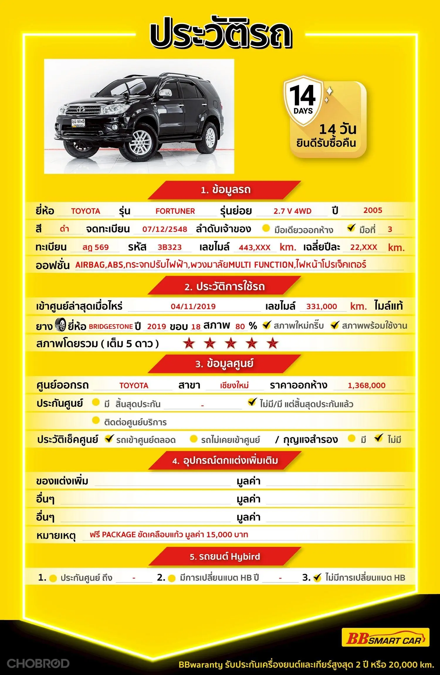 TOYOTA FORTUNER 2.7 V LPG AT4WD 2005 ราคา 229,000 (ขายสดเท่านั้น) Line:@bbcar03 🔥 จอง 199 บาท ส่งบัตรประชาชน รู้ผลอนุมัติภายใน 30 นาที ไม่ผ่านคืนเงินจองทุกกรณี 🔥 ซื้อรถกับ BB พร้อมให้คำปรึกษา แก้ทุกปัญหา ให้ทุกเรื่อง บริการ call center 24 ชม. 🔥 BB Care Plus รับประกันหลังการขาย สูงสุด 2 ปี หรือ 20,000 km. 🔥 มีรถให้เลือกมากกว่า 1,800 คัน สาขา 3 ถ.กาญจนาภิเษก ใกล้กับโลตัสบางใหญ่ รหัสรถ 3B323 ราคา 229,000 บ. (ขายสดเท่านั้น) Brand : ฺTOYOTA Year : 2005 Model : FORTUNER Grade : 2.7 V 4WD Engine : 2700 cc. Type : เบนซิน - LPG Gearbox : AT4WD Color : ดำ Mileage : 443,xxx km. (ซื้อสด ราคานี้ยังไม่รวมค่าดำเนินการ 10,000 บ.) 🚩 Price. 229,000 บาท ค่าดำเนินการ : 10,000 *เงื่อนไขเป็นไปตามที่ไฟแนนซ์กำหนด 🎗Car Hightlight มาแล้วค่ะ TOYOTA FORTUNER เครื่อง 2700 cc. เครื่องเบนซิน รถยนต์เอนกประสงค์ นั่งสบายถึง 7 ที่นั่ง มาพร้อมเทคโนโลยีล้ำสมัย รถไมล์แท้ ไม่มีชนหนัก ไม่มีน้ำท่วม 🎗ภายใน ภายในสะอาดเรียบร้อย มาพร้อมกับ พวงมาลัยเพาเวอร์ พวงมาลัย Multifunction เบรค ABS แอร์ แอร์ AUTO กุญแจรีโมท-สัญญานกันขโมย Airbag กระจกไฟฟ้า เซ็นทรัลล๊อก เบาะหนังแท้ วิทยุ - CD จอ LCD เล่น DVD 🎗ภายนอก ไม่มีชนหนักหรือพลิกคว่ำ น้ำท่วมกระจกมองข้างปรับไฟฟ้า กระจกมองข้างพับไฟฟ้า ไฟโปรเจคเตอร์ กระจกข้างโครเมี่ยม ล้อแม็ก เซนเซอร์ถอยหลัง บันไดข้าง ไฟซีนอน ไฟตัดหมอก แล็คหลังคา รถดูแลรักษาง่าย แถมช่วงล่างยังแน่นๆ ให้ความโดดเด่นเป็นเอกลักษณ์ของ TOYOTA ทดลองขับแล้วช่วงล่างและเครื่องยนต์ยังแน่นค่ะ 🎗ความคุ้มค่า สำหรับใครที่กำลังมองหารถใหม่ลองเข้ามาดู ประหยัดเงินไปเยอะมาก ใช้งานสะดวกสบาย ประหยัดน้ำมันมากๆ เทียบกับราคานี้ถือว่าคุ้มค่ามากๆ ทีมงานทำราคาที่ดีที่สุด เหมาะสมกับสภาพรถเทียบกับสเปคเดียวกันรับประกันเราขายถูกกว่าแน่นอน ⭐การรับประกันหลังการขาย BB Care Plus สูงสุด 2 ปี หรือ 20,000 km. ด้วยช่างที่ผ่านการอบรมจากศูนย์ชั้นนำของประเทศ 🎉Special offer เฉพาะ บีบีสมาร์ทคาร์ ที่นี่ที่เดียว ⭐ดอกเบี้ยเริ่มต้น 1.29% มีไฟแนนซ์รองรับหลายที่ค่ะ ⭐ฟรี!! แพคเก็จ ขัดเคลือบแก้ว มูลค่า 15,000 บาท ทุกคัน ⭐อนุมัติไว 30 นาที นำเอกสารมาให้ครบรับรถกลับบ้านทันทีค่ะ ⭐BB Care Plus รับประกันหลังการขาย สูงสุด 2 ปี หรือ 20,000 km. ⭐มี 6 สาขา ในกรุงเทพและปริมณฑลใกล้บ้านท่าน ⭐รถทุกคันผ่านตรวจสอบ Inspection เรียบแล้วค่ะ ผ่าน 5 ดาวทุกคันค่ะ ⭐เซลล์ทุกท่านเป็นมืออาชีพพร้อมให้บริการทุกท่านแน่นอนค่ะ เลือกข้อเสนอที่ให้คุณมากกว่าที่อื่น เพราะเราเล็งเห็นแล้ว ที่บีบีสมาร์ทคาร์ ให้คุณได้มากกว่าที่อื่นแน่นอนค่ะ มาที่เดียวจบทุกปัญหา หลากหลายรุ่นให้เลือกกับบริการที่คุณต้องประทับใจแน่นอนค่ะ