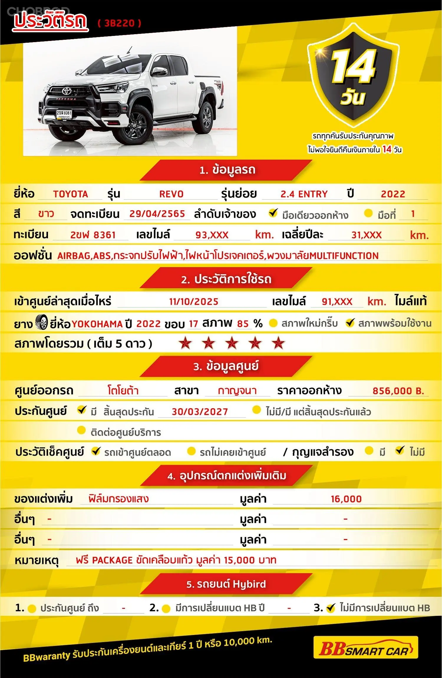 TOYOTA REVO 2.4 ENTRY PRERUNNER DOUBLE CAB AT2022 ออกรถ 0 บาท จัดได้ 609,000 บ. Line:@bbcar03 🔥 จอง 199 บาท ส่งบัตรประชาชน รู้ผลอนุมัติภายใน 30 นาที ไม่ผ่านคืนเงินจองทุกกรณี 🔥 ซื้อรถกับ BB พร้อมให้คำปรึกษา แก้ทุกปัญหา ให้ทุกเรื่อง บริการ call center 24 ชม. 🔥 BB Care Plus รับประกันหลังการขาย สูงสุด 2 ปี หรือ 20,000 km. 🔥 มีรถให้เลือกมากกว่า 1,800 คัน สาขา 3 ถนนกาญจนาภิเษก ใกล้กับโลตัสบางใหญ่ รหัสรถ 3B220 ราคา 589,000 บ. ผ่อนเพียง 10,028 บ. Brand : TOYOTA Year : 2022 Model : REVO Grade : 2.4 ENTRY PRERUNNER DOUBLE CAB Engine : 2400 cc. Type : ดีเซล Gearbox : A/T Color : ขาว Mileage : 93,XXX km. (ซื้อสด ราคานี้ยังไม่รวมค่าดำเนินการ 10,000 บ.) 🚩 Price 589,000 บาท ยอดจัด : 599,000 บาท เงินดาวน์ : ฟรีเงินดาวน์ ประกันภัย : ฟรีประกันภัย 1 ปี ค่าดำเนินการ : 10,000 บาท รวมออกรถ : 0 บาท ผ่อน 36 = 19,294 บาท ผ่อน 48 = 14,843 บาท ผ่อน 60 = 12,333 บาท ผ่อน 72 = 11,033 บาท ผ่อน 84 = 10,028 บาท *เงื่อนไขเป็นไปตามที่ไฟแนนซ์กำหนด โปรโมชั่นพิเศษ สำหรับลูกค้าเครดิตดี 🚩เลือกรับเรทดอกเบี้ยพิเศษ 📍36 งวด = 1.29% 📍48 งวด = 1.99% 📍60 งวด = 2.39% 📍72 งวด = 3.59% 🔥 เงื่อนไข โปรโมชั่น ดอกเบี้ยเริ่มต้น 1.29% ตลอดอายุสัญญา - ยอดจัดไฟแนนซ์ 300,000-600,0000 บาท - ผ่อนสูงสุด 72 เดือน - เป็นลูกค้าประวัติดี พนักงานประจำ เงินเดือน 20,000 บาท ขึ้นไป - ค่าดำเนินการแคมเปญ 20,000 บาท (รวมในยอดจัดได้) 🎗Car Hightlight รถสวยๆ วันนี้ขอแนะนำ TOYOTA REVO มีพละกำลังเครื่องยนต์ที่ใช้ได้อย่างเหลือเฟือ ลุยได้ทุกสถานการณ์ แถมออปชั่นภายในครบเครื่อง ช่วงล่างนุ่มนวลดูดซับแรงสะเทือนได้ดีมาก ใช้งานได้ง่ายสะดวกสบายสุดๆเลยค่ะ 🎗ภายใน ภายในสะอาดเรียบร้อย มาพร้อมกับ Cruise Control เบาะหนังแท้ แอร์ ไมล์ Digital เบาะหนัง เซ็นทรัลล๊อก กุญแจรีโมท-สัญญานกันขโมย เบรค ABS พวงมาลัย Multifunction พวงมาลัยเพาเวอร์ Airbag จอ LCD เล่น DVD วิทยุ - CD อ๊อฟชั่นครบคันเลยค่ะ สภาพใหม่มากค่ะ 🎗ภายนอก สภาพรถพร้อมใช้งาน ไม่มีชนหนัก น้ำท่วม เลขเครื่อง เลขถังตรง กระจกมองข้างปรับไฟฟ้า กระจกไฟฟ้า กระจกข้างโครเมี่ยม แม็กลายเนอร์ ไฟซีนอน บันไดข้าง ไฟตัดหมอก กระจกมองข้างพับไฟฟ้า ไฟโปรเจคเตอร์ ไฟเลี้ยวกระจกมองข้าง 🎗ความคุ้มค่า รถสภาพนี้หายากมากค่ะบอกเลย รถไมล์แท้อีกด้วย คัดเลือกคันนี้มาแล้วค่ะสภาพดีมากๆ เทียบกับราคานี้ถือว่าคุ้มค่ามากๆค่ะ มาดูรถไม่ผิดหวังแน่นนอนค่ะ ⭐การรับประกันหลังการขาย BB Care Plus สูงสุด 2 ปี หรือ 20,000 km. ด้วยช่างที่ผ่านการอบรมจากศูนย์ชั้นนำของประเทศ 🎉Special offer เฉพาะ บีบีสมาร์ทคาร์ ที่นี่ที่เดียว ⭐ดอกเบี้ยเริ่มต้น 1.29% มีไฟแนนซ์รองรับหลายที่ค่ะ ⭐ฟรี!! แพคเก็จ ขัดเคลือบแก้ว มูลค่า 15,000 บาท ทุกคัน ⭐อนุมัติไว 30 นาที นำเอกสารมาให้ครบรับรถกลับบ้านทันทีค่ะ ⭐BB Care Plus รับประกันหลังการขาย สูงสุด 2 ปี หรือ 20,000 km. ⭐มี 6 สาขา ในกรุงเทพและปริมณฑลใกล้บ้านท่าน ⭐รถทุกคันผ่านตรวจสอ
