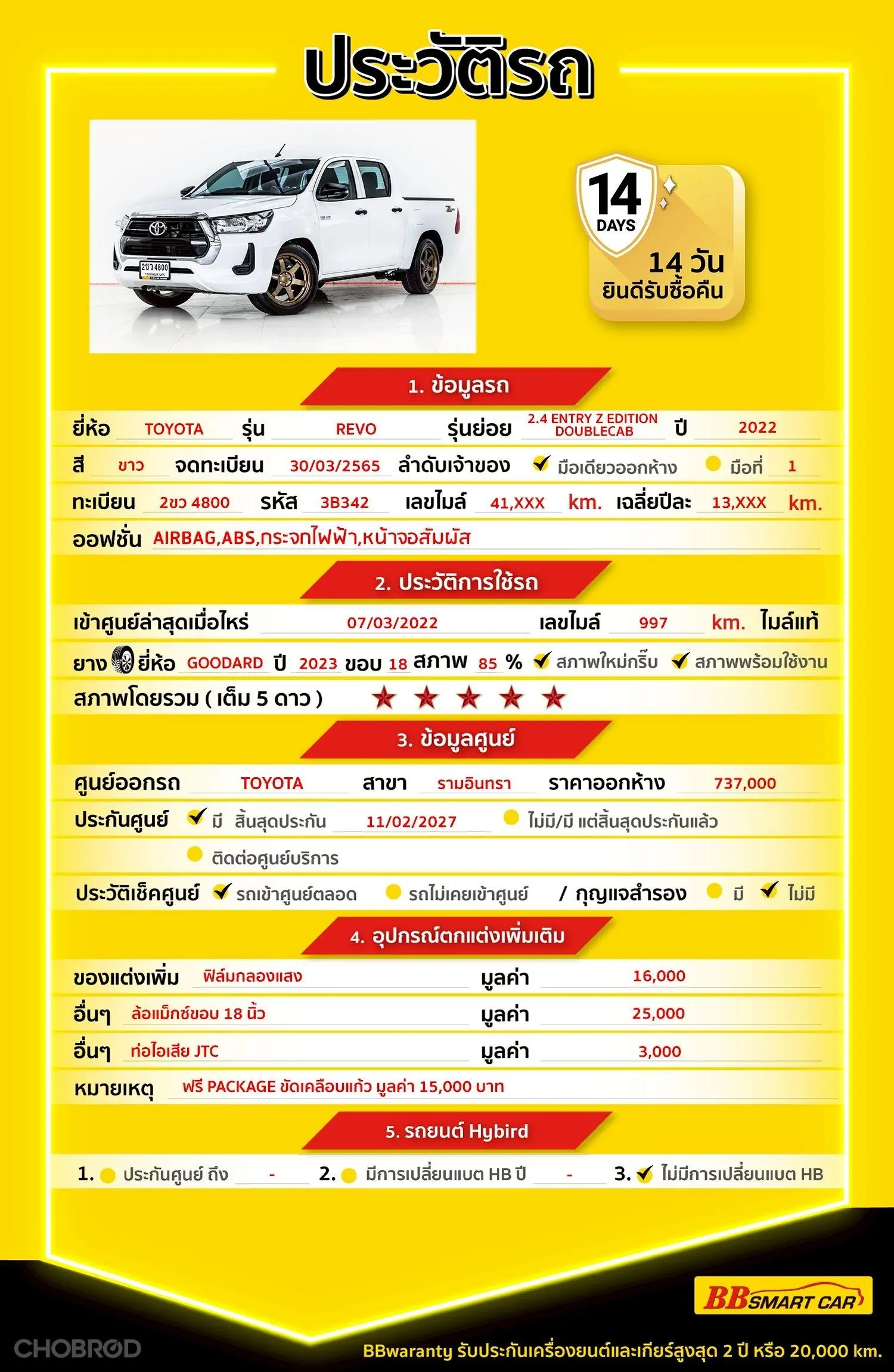 มีการรับประกันจากดีลเลอร์ (6 เดือน) มีบริการช่วยเหลือฉุกเฉินบนท้องถนน 24 ชม. จากดีลเลอร์
