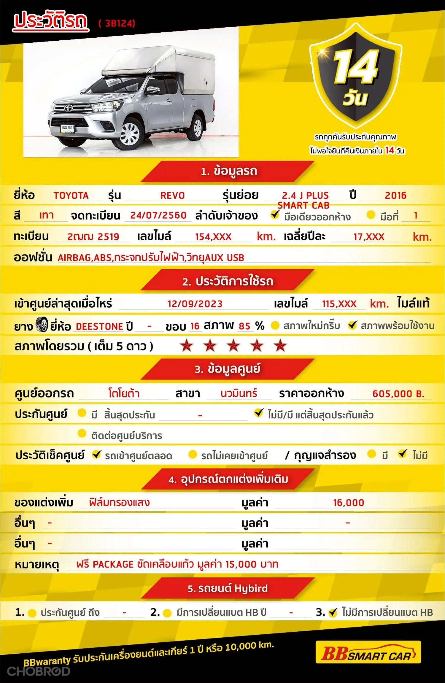 TOYOTA REVO 2.7 J PLUS SMART CAB MT 2016 ออกรถ 0 บาท จัดได้ 289,000 บ. Line:@*******แสดงข้อมูล 🔥 จอง 199 บาท ส่งบัตรประชาชน รู้ผลอนุมัติภายใน 30 นาที ไม่ผ่านคืนเงินจองทุกกรณี 🔥 ซื้อรถกับ BB พร้อมให้คำปรึกษา แก้ทุกปัญหา ให้ทุกเรื่อง บริการ call center 24 ชม. 🔥 BB Care Plus รับประกันหลังการขาย สูงสุด 2 ปี หรือ 20,000 km. 🔥 มีรถให้เลือกมากกว่า 1,600 คัน สาขา 3 ถนนกาญจนาภิเษก ใกล้โลตัสบางใหญ่ รหัสรถ 3B124 ราคา 269,000 บ. ผ่อนเพียง 5,420 บ. Brand : TOYOTA Year : 2016 Model : REVO Grade : 2.7 J PLUS SMART CAB Engine : 2700 cc. Type : เบนซิน Gearbox : M/T Color : เทา Mileage : 154,XXX km. (ซื้อสด ราคานี้ยังไม่รวมค่าดำเนินการ 10,000 บ.) 🚩 Price 269,000 บาท ยอดจัด : 279,000 บาท เงินดาวน์ : ฟรีเงินดาวน์ ประกันภัย : ฟรีประกันภัย 1 ปี ค่าดำเนินการ : 10,000 บาท รวมออกรถ : 0 บาท ผ่อน 36 = 9,723 บาท ผ่อน 48 = 7,649 บาท ผ่อน 60 = 6,468 บาท ผ่อน 72 = 5,763 บาท ผ่อน 84 = 5,420 บาท *เงื่อนไขเป็นไปตามที่ไฟแนนซ์กำหนด โปรโมชั่นพิเศษ สำหรับลูกค้าเครดิตดี 🚩เลือกรับเรทดอกเบี้ยพิเศษ 📍36 งวด = 2.59% 📍48 งวด = 2.89% 📍60 งวด = 3.29% 📍72 งวด = 4.49% 🔥 เงื่อนไข โปรโมชั่น ดอกเบี้ยเริ่มต้น 2.59% ตลอดอายุสัญญา - ยอดจัดไฟแนนซ์ 300,000-600,0000 บาท - ผ่อนสูงสุด 72 เดือน - เป็นลูกค้าประวัติดี - ค่าดำเนินการแคมเปญ 20,000 บาท (รวมในยอดจัดได้) 🎗Car Hightlight รถสวยๆ วันนี้ขอแนะนำ TOYOTA REVO มีพละกำลังเครื่องยนต์ที่ใช้ได้อย่างเหลือเฟือ ลุยได้ทุกสถานการณ์ แถมออปชั่นภายในครบเครื่อง ช่วงล่างนุ่มนวลดูดซับแรงสะเทือนได้ดีมาก ใช้งานได้ง่ายสะดวกสบายสุดๆเลยค่ะ 🎗ภายใน ภายในสะอาดเรียบร้อย มาพร้อมกับ เซ็นทรัลล๊อก เบาะผ้า พวงมาลัยเพาเวอร์ เบรค ABS แอร์ วิทยุ - CD กระจกไฟฟ้า กุญแจรีโมท-สัญญานกันขโมย กระจกมองข้างปรับไฟฟ้า Airbag อ๊อฟชั่นครบคันเลยค่ะ สภาพใหม่มากค่ะ 🎗ภายนอก TOYOTA REVO คันนี้ พร้อมบรรทุกเต็มพิกัด และมีอัตราเร่งที่น่าประทับใจ ไฟซีนอน แม็กลายเนอร์ ไฟเลี้ยวกระจกมองข้าง กระจกมองข้างพับไฟฟ้า กระจกข้างโครเมี่ยม 🎗ความคุ้มค่า รถสภาพนี้หายากมากค่ะบอกเลย รถไมล์แท้อีกด้วย คัดเลือกคันนี้มาแล้วค่ะสภาพดีมากๆ เทียบกับราคานี้ถือว่าคุ้มค่ามากๆค่ะ มาดูรถไม่ผิดหวังแน่นนอนค่ะ ⭐การรับประกันหลังการขาย BB Care Plus สูงสุด 2 ปี หรือ 20,000 km. ด้วยช่างที่ผ่านการอบรมจากศูนย์ชั้นนำของประเทศ 🎉Special offer เฉพาะ บีบีสมาร์ทคาร์ ที่นี่ที่เดียว ⭐ดอกเบี้ยเริ่มต้น 2.59% มีไฟแนนซ์รองรับหลายที่ค่ะ ⭐ฟรี!! แพคเก็จ ขัดเคลือบแก้ว มูลค่า 15,000 บาท ทุกคัน ⭐อนุมัติไว 30 นาที นำเอกสารมาให้ครบรับรถกลับบ้านทันทีค่ะ ⭐BB Care Plus รับประกันหลังการขาย สูงสุด 2 ปี หรือ 20,000 km. ⭐มี 6 สาขา ในกรุงเทพและปริมณฑลใกล้บ้านท่าน ⭐รถทุกคันผ่านตรวจสอบ Inspection เรียบแล้วค่ะ ผ่าน 5 ดาวทุกคันค่ะ ⭐เซลล์ทุกท่านเป็นมืออาชีพพร้อมให้บริการทุกท่านแน่นอนค่ะ เลือกข้อเสนอที่ให้ค