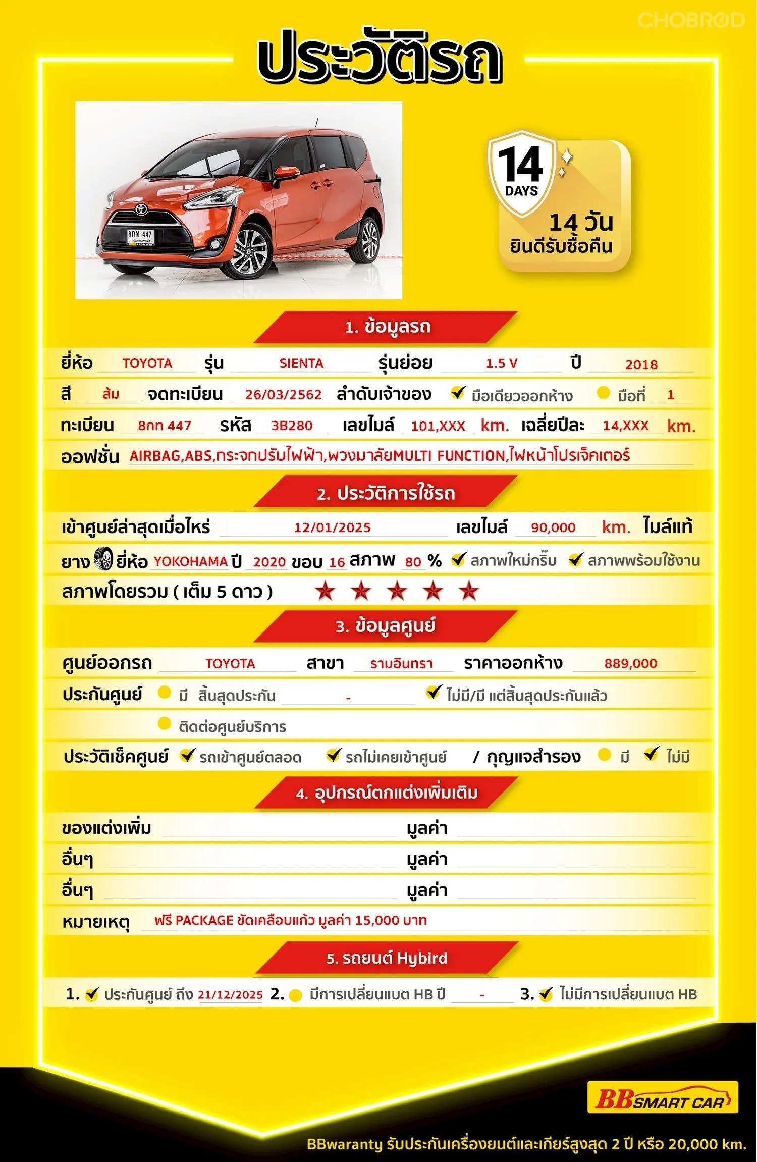 TOYOTA SIENTA 1.5 V AT 2018 ออกรถ 0 บาท จัดได้ 424,000 บ. Line:@bbcar03 🔥 จอง 199 บาท ส่งบัตรประชาชน รู้ผลอนุมัติภายใน 30 นาที ไม่ผ่านคืนเงินจองทุกกรณี 🔥 ซื้อรถกับ BB พร้อมให้คำปรึกษา แก้ทุกปัญหา ให้ทุกเรื่อง บริการ call center 24 ชม. 🔥 BB Care Plus รับประกันหลังการขาย สูงสุด 2 ปี หรือ 20,000 km. 🔥 มีรถให้เลือกมากกว่า 1,800 คัน สาขา 3 ถนนกาญจนาภิเษก ใกล้กับโลตัสบางใหญ่ รหัสรถ 3B280 ราคา 404,000 บ. ผ่อนเพียง 7,015 บ. Brand : TOYOTA Year : 2018 Model : SIENTA Grade : 1.5 V Engine : 1500 CC. Type : เบนซิน Gearbox : A/T Color : ส้ม Mileage : 101,xxx km. (ซื้อสด ราคานี้ยังไม่รวมค่าดำเนินการ 10,000 บ.) 🚩 Price : 404,000 บาท ยอดจัด : 414,000 บาท เงินดาวน์ : ฟรีเงินดาวน์ ประกันภัย : ฟรีประกันภัย 1 ปี ค่าดำเนินการ : 10,000 บาท รวมออกรถ : 0 บาท ผ่อน 36 = 13,496 บาท ผ่อน 48 = 10,382 บาท ผ่อน 60 = 8,626 บาท ผ่อน 72 = 7,718 บาท ผ่อน 84 = 7,015 บาท *เงื่อนไขเป็นไปตามที่ไฟแนนซ์กำหนด โปรโมชั่นพิเศษ สำหรับลูกค้าเครดิตดี 🚩เลือกรับเรทดอกเบี้ยพิเศษ 📍36 งวด = 1.29% 📍48 งวด = 1.99% 📍60 งวด = 2.39% 📍72 งวด = 3.59% 🔥 เงื่อนไข โปรโมชั่น ดอกเบี้ยเริ่มต้น 1.29% ตลอดอายุสัญญา - ยอดจัดไฟแนนซ์ 300,000-600,0000 บาท - ผ่อนสูงสุด 72 เดือน - เป็นลูกค้าประวัติดี พนักงานประจำ เงินเดือน 20,000 บาท ขึ้นไป - ค่าดำเนินการแคมเปญ 20,000 บาท (รวมในยอดจัดได้) 🎗Car Hightlight โตโยต้า เซียนต้า ที่นับว่าเป็นของหรูสำหรับ MPV ขนาดเล็ก ดีไซน์รถน่ารัก ภายในกว้าง พื้นที่ใช้สอยเยอะ สามารถใช้งานได้ทั้งครอบครัว เหมาะกับครอบครัวใหญ่ที่ต้องการรถครอบครัวราคาประหยัด หรือไม่ก็ผู้หญิงที่ชอบช็อปของทีเดียวเยอะๆ 🎗ภายใน. ภายในถูกออกแบบให้ดูเรียบๆ ดูสบายตา แอร์ AUTO Airbag กระจกไฟฟ้า จอ LCD เล่น DVD กระจกมองข้างปรับไฟฟ้า พวงมาลัยเพาเวอร์ ไมล์ Digital เซ็นทรัลล๊อก กุญแจรีโมท-สัญญานกันขโมย พวงมาลัย Multifunction เบรค ABS แอร์ เบาะหนังแท้ แอร์ราว 🎗ภายนอก. โตโยต้า เซียนต้า มี ไฟโปรเจคเตอร์ ไฟเลี้ยวกระจกมองข้าง ไฟตัดหมอก ไฟซีนอน กระจกมองข้างพับไฟฟ้า กล้องส่องหลัง 🎗ความคุ้มค่า รถสภาพนี้หายากมากค่ะบอกเลย รถไมล์แท้อีกด้วย คัดเลือกคันนี้มาแล้วค่ะสภาพดีมากๆ เทียบกับราคานี้ถือว่าคุ้มค่ามากๆค่ะ ⭐การรับประกันหลังการขาย BB Care Plus สูงสุด 2 ปี หรือ 20,000 km. ด้วยช่างที่ผ่านการอบรมจากศูนย์ชั้นนำของประเทศ 🎉Special offer เฉพาะ บีบีสมาร์ทคาร์ ที่นี่ที่เดียว ⭐ดอกเบี้ยเริ่มต้น 1.29% มีไฟแนนซ์รองรับหลายที่ค่ะ ⭐ฟรี!! แพคเก็จ ขัดเคลือบแก้ว มูลค่า 15,000 บาท ทุกคัน ⭐อนุมัติไว 30 นาที นำเอกสารมาให้ครบรับรถกลับบ้านทันทีค่ะ ⭐BB Care Plus รับประกันหลังการขาย สูงสุด 2 ปี หรือ 20,000 km. ⭐มี 6 สาขา ในกรุงเทพและปริมณฑลใกล้บ้านท่าน ⭐รถทุกคันผ่านตรวจสอบ Inspection เรียบแล้วค่ะ ผ่าน 5 ดาวทุกคันค่ะ ⭐เซลล์ทุกท่านเป็นมืออาชีพพร้อมให้บริการทุกท่านแน่นอนค่ะ เลือกข้อเสนอที่ให้คุณมา